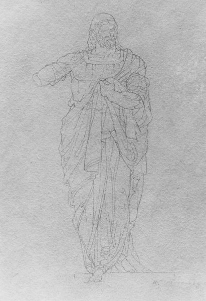 Francesco La Marra made this drawing of a standing man in antique costume sometime in the 18th century. It is made using pen and brown ink on paper. The lines are economical and swift, indicating a confidence in La Marra's hand, and a mind that already knows what it wants to say. The texture of the paper is visible, and this rough materiality provides a visual contrast with the smooth, idealized form of the figure. Note how La Marra has used hatching techniques to add tone, volume, and depth. The man's clothing appears to be classical in style, though its rendering is more gestural than strictly representational. The sketch gives an impression of the way the fabric drapes and folds, accentuating the figure's pose. Drawings like this were functional for artists in the 1700s, a way to develop ideas, study forms, and prepare for larger paintings or sculptures. Thinking about the drawing in this way brings us closer to the working process of the artist, and the vital role of craft in fine art.