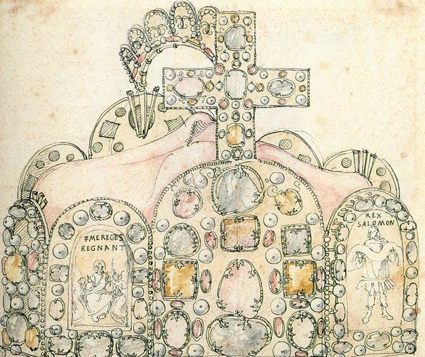 Curator: Take a look at Adolf Wölfli's "Leantika,=Riesen=Grand=Hottell, in Lion=See; Indien," created in 1922. It's a work on paper combining watercolor and drawing techniques. Editor: Wow, it’s immediately striking! The intense symmetry, the almost obsessive detail—it has the feel of a Byzantine icon reimagined as architectural fantasy. What are we looking at materially here? Curator: Wölfli, an outsider artist, employed simple means—colored pencils, graphite, and watercolor on paper. Given his background, these would've been easily accessible, inexpensive materials within the psychiatric hospital where he spent much of his life. Editor: It definitely speaks to themes of confinement and escapism. The elaborate, almost hallucinatory details—the creatures, the repeated faces, that clock face at the very top of the hotel–they give it this incredible otherworldly quality. How might this vision connect to his personal narrative? Curator: That's critical to consider. Wölfli was institutionalized for much of his adult life, and his art became a form of self-therapy and world-building. His mental state, and that reality, fueled his need to construct these intricate worlds, and doing so required particular skills of making as he translated the architecture of Europe that he witnessed in books, into his unique form. Editor: I see so much yearning in it–for stability, for travel, for recognition. It’s fascinating how this imaginary hotel in Lion=See becomes this powerful symbol of both refuge and imprisonment. This blending and the way in which the drawing on paper mimics the architecture of, perhaps, an ancient and sacred city is not to be missed. The social dimension of mental health institutions also calls for a dialogue in the art itself, where this piece of art allows for many diverse opinions of it. Curator: The systematic approach—the way he painstakingly builds layer upon layer of color and form—it speaks volumes about his need for control and order within a world that must have felt incredibly chaotic. The labor in his drawings gives the viewers so much to enjoy. Editor: Absolutely. By understanding his processes and tools, we understand his lived reality, as you indicate. It helps deconstruct the romanticized image of the solitary, suffering artist and positions Wölfli's creation within the broader context of mental health, institutionalization, and resistance. Curator: Agreed, understanding these material constraints is pivotal in examining the value, production, and reception of his art, isn't it? It's amazing how his art becomes a testament to both restriction and resilience. Editor: It gives you a sense of profound depth. This experience of studying Wölfli's Grand Hotel certainly opened my mind to different perspectives of art creation in the modern day.