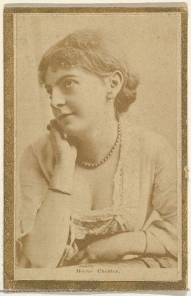 Curator: Take a moment to observe this small, sepia-toned card. It's entitled "Card 652, Maud Wentworth, from the Actors and Actresses series (N45, Type 2) for Virginia Brights Cigarettes," dating roughly between 1885 and 1891, crafted by Allen & Ginter. Editor: My first thought is how delicate yet strong the image appears. The limited tonal range gives it an air of antique fragility, while the subject's resolute gaze is very striking. Curator: Indeed. These cards, mass-produced through printing and photographic techniques, were originally packaged with cigarettes, a fascinating example of early advertising meeting popular culture. We should keep in mind that actors and actresses held a peculiar position in society at that time: publicly celebrated figures, but somewhat associated with spectacle and leisure. Editor: Right, there is a tangible tension visible in this portrait. Her face is cast in partial shadow, yet it is the most striking compositional element. This formal choice accentuates her features: high cheekbones, delicate features, a regal bearing. How do you interpret the material limitations in this context? Curator: I find it important to note the limitations are directly linked to mass production of the piece: The material processes themselves, cheap printing techniques combined with photographic reproduction, speak volumes. Virginia Brights appropriated the appeal of fame in an attempt to normalize and glamourise their brand of cigarettes, which I believe can also tell us a lot about contemporary ideas around leisure. Editor: Fascinating how they captured such intricate details, especially in the ornamentation of her hair. The composition is quite deliberate, and speaks to the artist's manipulation of the medium, transcending its origins in popular advertisement. Curator: I agree. It's the convergence of these details - Wentworth's carefully cultivated image as an actress, the means of production involved, and the overall context - that reveal deeper truths about the era and the artwork. Editor: Exactly. Examining its forms provides an isolated view, while its manufacturing context offers insight on the economic landscape during the time of production. Curator: It is these contrasts that makes me enjoy the piece all the more. Thank you. Editor: Likewise. The convergence of high art and everyday ephemera makes this portrait truly memorable.
