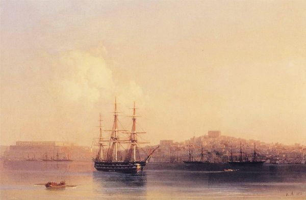 Curator: Aivazovsky's 1845 painting, "Dusk on the Golden Horn," depicts a stunning sunset over Istanbul. What captures your attention first? Editor: It’s the sheer luminosity. The hazy golden light infuses the scene with such a calm, almost melancholic, atmosphere. Look at how it shimmers on the water and silhouettes the ships. Curator: Absolutely. The masterful use of light is classic Aivazovsky, but it also served a specific social function. Remember the Romantic era's fascination with exotic locales and empires. He’s presenting a vision of the Ottoman Empire tinged with that aesthetic, produced and consumed by a specific European audience hungry for such images. Editor: That golden hue isn't just aesthetic; it speaks to cultural memory. Gold is associated with wealth, power, divinity, and the idea of a "golden age," all projected onto this view of Constantinople. The numerous boats converging toward the city suggests the city's central position in trade and connection of ideas. Curator: I find the composition particularly revealing. The ships, rendered with clear detail, probably relied on sketches done from observation. But how were those ships built and maintained? What sort of labour was exploited so they would appear in the end on this romantic scene? What goods were traded and what social relations underpinned the economy? Editor: The vessels also evoke a certain freedom, exploration, adventure... think of the "ships of state" metaphors. Curator: But there's a dark side too, ships can mean colonial power. What’s implied here through this scene? Who profited, who suffered? Oil paint itself came to signify a certain level of status both for painter and for consumer. Editor: That's the power of images; they resonate on many levels simultaneously. Looking at the city fading in the distance behind the ships I am reminded that even powerful empires face the setting sun, change and the inevitable passage of time. Curator: Seeing through the surface, identifying both beauty and underlying realities allows us to develop a much broader picture, doesn't it? Editor: Indeed, appreciating those dualities lets us see what resonates across time, as well as how things have fundamentally transformed.