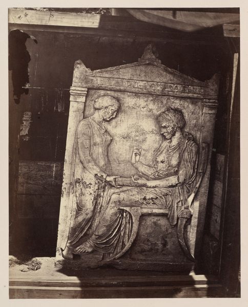 Editor: This is William James Stillman’s photograph, “Fragment from Balustrade of the Temple of Athena Nike, Acropolis, Athens,” taken between 1877 and 1887. The stone looks incredibly worn, almost soft despite its age, and there is such beautiful depth in the draping. How do you read this composition, focusing on form? Curator: A pertinent question. First, note the deliberate framing by Stillman. He isolates the fragment, directing our gaze to the interplay of light and shadow upon the sculpted drapery. Observe how the folds create a dynamic rhythm, moving from deep recesses to sharply illuminated crests. This chiaroscuro is not merely descriptive; it shapes our perception of volume and texture. Editor: So, it is less about what the sculpture represents, and more about how its components interact? Curator: Precisely. We analyze the internal logic of the piece. How does the diagonal thrust of the body contrast with the verticality of the supporting block? The tension established thereby creates a visual staccato. Also, consider the textures captured. The coarse grain of the stone is juxtaposed against the implied smoothness of the garment, enriching the sensory experience. How might these material qualities influence our understanding? Editor: I see what you mean. The textures emphasize both the age of the ruin, and the sensuality of the draped form. It’s about contrasts in texture and light, making a statement within the piece itself. Curator: Indeed. Stillman has used photographic techniques to reveal and emphasize the enduring beauty of the fragmented sculpture, making it stand as an interesting interplay between what is broken and what still thrives in the forms.