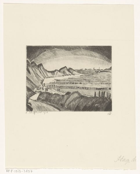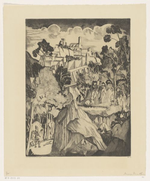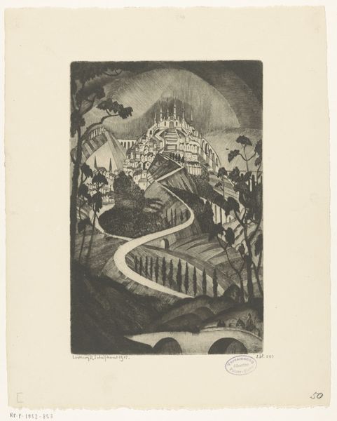 Curator: This etching, titled "Berg," created in 1915 by Lodewijk Schelfhout, presents an almost fantastical cityscape rendered in sharp, expressive lines. Editor: Oh, immediately, I'm struck by the drama. It's like a stage set, this looming mountain crowned with civilization. Gives me a very… impending sense of the uncanny. What do you think Schelfhout was trying to evoke? Curator: The graphic nature of the etching lends itself to symbolic interpretation. Consider how cities have often been seen, depending on the historical era and culture, as the best hope or ultimate doom for civilization. Do you see echoes of either? Editor: Both, definitely! The tight, almost claustrophobic way the buildings are packed together speaks of density, potential…and the road snaking its way up reminds me of life’s journey toward some unknown and possibly overwhelming endpoint. But then you've got those sturdy little trees standing at odd angles, like they are desperately hanging on. There’s something comforting about them. Curator: Notice the masterful use of line; see how the varying densities and directions create depth and texture in this monochromatic piece? Schelfhout is creating almost dream-like qualities using nothing more than marks in dark ink, allowing for a fluidity within structure. It also allows for the play with dark and light. Editor: Yes! The strong contrast amplifies that tension. The shadows seem almost to have substance, adding to this whole feel of looming fate or, let’s be optimistic, challenge to be faced, in turn becoming a monument. I’d be interested in seeing how he felt about the events unfolding across Europe at the time… It would bring it more to life somehow! Curator: Indeed! The combination of intricate geometric forms within the sweeping landscape suggests a search for order amidst, potentially, what could feel like societal chaos. Editor: This feels both monumental and deeply intimate—I mean, you can almost feel his hand guiding the stylus across the metal plate. I appreciate how "Berg" invites us into a conversation with not just a cityscape but the emotional landscape within ourselves, as well. Curator: Absolutely, I think we've only begun to scratch the surface here—an image with profound questions about structure, freedom, and even legacy to explore.