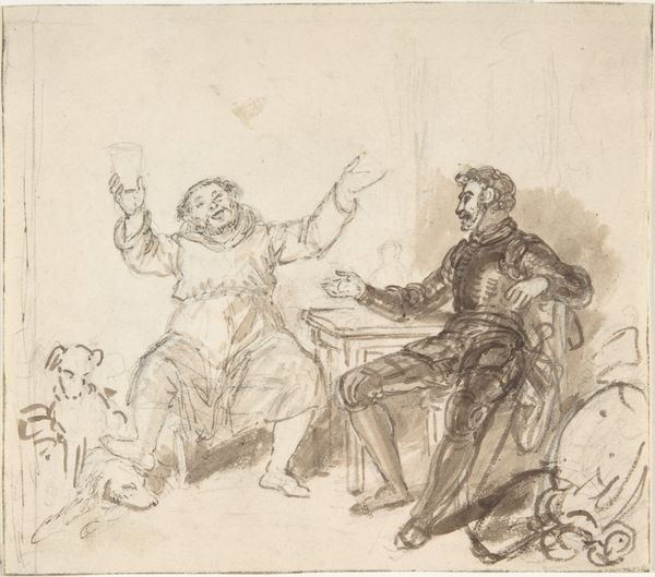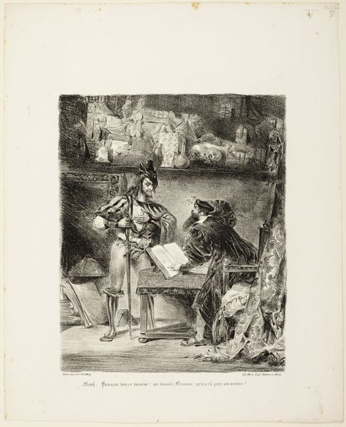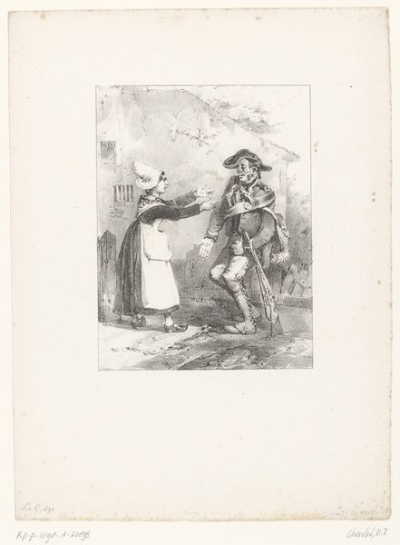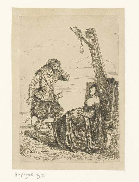 This etching, "A Soldier Stands by a Woman Seated Under a Gallows," was made by Guillaume Joseph Vertommen in the 19th century. The artist employed etching, an intaglio printmaking technique where a metal plate is coated with a waxy resist, and then the image is scratched into the surface. The plate is then immersed in acid, which bites into the exposed metal, creating lines that hold ink. The etched lines define the contours of the figures, their clothing, and the ominous gallows. The quality of the lines—thin, scratchy, and densely packed—creates tonal variation, capturing the somber mood of the scene. This mode of production is critical to understanding the artist's concept. Printmaking, like etching, democratized artmaking, and these kinds of prints were often made and sold to a wide public. Materials, making, and context are therefore important elements of the image.