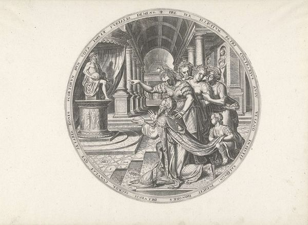 Curator: Ah, here we have "Tobias Heals the Blind Tobit," a print from between 1601 and 1652, currently held at the Rijksmuseum. The piece depicts a story with rich characters. I feel a certain serenity from this print, almost like the moment just before a miracle happens. What is your take on this piece, though? Editor: I agree; the serenity is strong. What jumps out at me, aside from the obvious healing moment, is the use of line – it's so precise! What strikes you most about it? Curator: For me, it's the intimacy conveyed through the linear precision, you nailed it. There is a captivating juxtaposition: Tobias, guided by the angel, delicately heals his father's blindness with gall from a fish – odd cure, I know, but so potent for artistic storytelling. I wonder how the choice of a circular format plays into your interpretation, what feelings does it elicit from you? Editor: The circle feels enclosing, like a little snow globe scene... or like we're peering into a secret, domestic moment made sacred. I also didn't expect the humour...the dog and the cure…! Curator: Exactly! Baroque art does that--it melds the high and low, sacred and silly. Perhaps the circle implies divine protection and completeness, too, encompassing the miraculous event. Looking at the composition now, and thinking about its symbolic intention… what do you get? Editor: I now think it amplifies the event. Plus, seeing this print reminds me that faith and healing aren't always solemn affairs. There can be lightness and… dog-like loyalty, haha! Curator: Beautifully put! So, "Tobias Heals the Blind Tobit"... ultimately not just a biblical scene but an observation about how grace intersects with everyday existence.