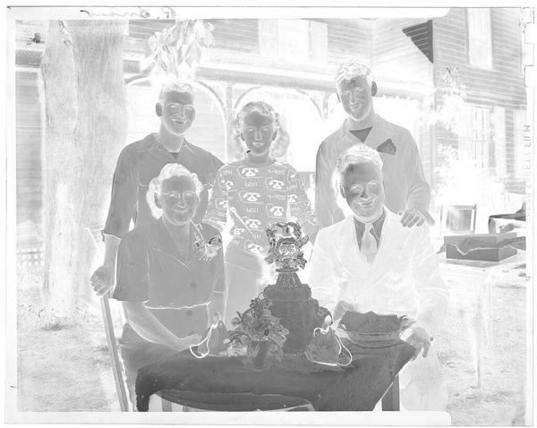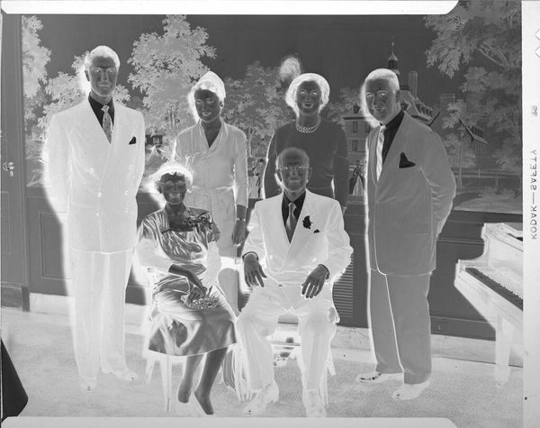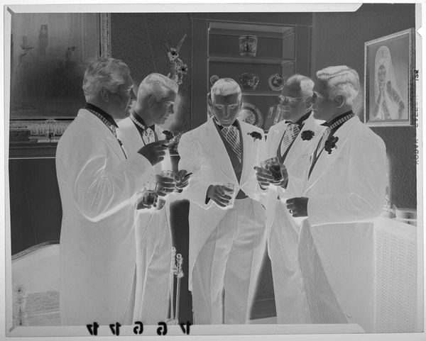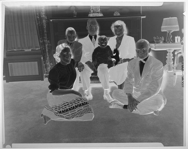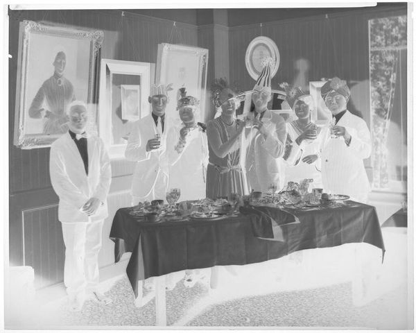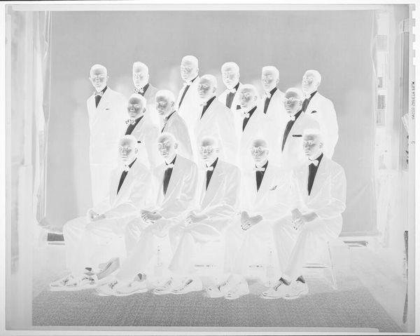 Curator: Here we have John Deusing's "Untitled (portrait of a team with rackets)," held at the Harvard Art Museums. The image measures roughly 8 by 10 inches. Editor: My first impression is that this image looks like an eerie negative, with these young men holding tennis rackets, almost like weapons. Curator: Indeed. Consider the context of amateur sports at institutions like Harvard. Sports teams cultivate a sense of institutional pride and promote the idea of a socially cohesive elite. Editor: And look at the uniformity of their attire. The crisp white pants, the dark shirts—it speaks to the standardization of leisure itself. Even their rackets, tools of their sport, are identical. Curator: The man in the suit stands apart, maybe the coach or a faculty advisor, embodying the institutional support of this team. He legitimizes their activity. Editor: I am struck by the materiality. This is not some perfectly staged, glossy promotional photo. It reveals something rawer about the construction of this image and their social standing. Curator: Agreed. It captures more than just a team; it reflects the societal structures at play. Editor: Absolutely. It reveals how even in recreation, class and control are so visibly woven into the picture.