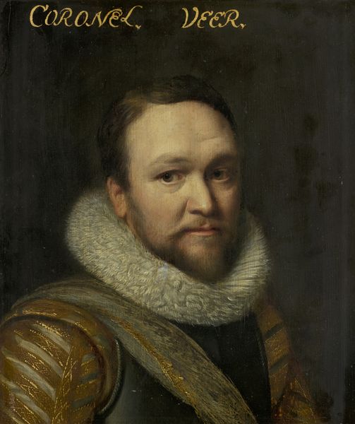 Editor: Here we have "Portrait of a Man, possibly Joris van Cats," an oil painting from around 1621 by an anonymous artist. He certainly looks the part of a Dutch Golden Age figure! I'm immediately drawn to his stern expression and elaborate ruff. What can you tell us about how society influenced paintings like this? Curator: That's a great observation. During the Dutch Golden Age, portraiture became a powerful tool for the burgeoning merchant class. These paintings weren't just about capturing likeness; they were about projecting status, respectability, and civic virtue. Notice the somber colors and the careful attention to detail in the ruff, a symbol of wealth and refinement. The question, though, is: whose values were truly being reflected here? Editor: So, this is less about the individual and more about conveying a societal expectation? Is it also about self-promotion? Curator: Precisely. Think of these portraits as carefully constructed PR. The sitter controls the narrative through clothing, pose, and even the inclusion of symbolic objects. The two crests at the top corners are examples. And let's consider where these images would have been displayed – in homes, council chambers, spaces meant to impress upon visitors a family's or individual’s power. Do you think that affects our reading of the portrait today? Editor: Absolutely. Seeing it in a museum gives it a different kind of weight, a historical distance. I never thought about portraits as PR before. That perspective really changes things for me. Curator: Indeed. By examining the social function of these paintings, we gain insight not only into the lives of the portrayed, but into the values and power structures of the era itself. A mirror to their aspirations and self-image. Editor: I will think twice about portraiture next time. Thanks!