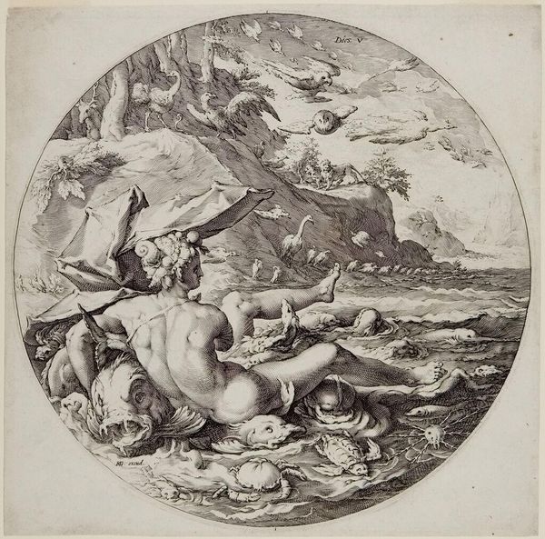 Editor: Here we have Jan Muller’s engraving, "The Second Day (Dies II): The Division of the Waters," created in 1589. The composition, enclosed in a circle, depicts several nude figures in a rather dramatic scene. What is your interpretation of this piece? Curator: Well, let's consider the historical and social context. This engraving belongs to a series illustrating the Creation story. Muller, working within the Northern Renaissance tradition, presents a blend of Christian narrative and classical allegory. Think about the role of religious imagery during this period; how did prints like this function in disseminating religious ideas? Editor: So, it’s not just a literal depiction of the Bible, but also a statement on cultural values? Curator: Exactly. Notice how the figures are rendered with idealized bodies, echoing classical sculpture. This visual language, while celebrating divine creation, also reinforces existing social hierarchies and ideals of beauty. The "division of the waters" becomes not just a physical act, but a demonstration of power and order. Editor: The figure representing water looks a bit... defeated, almost? Curator: Precisely! The engraving arguably represents a taming of the natural world, a recurring theme in Renaissance art. The engraving speaks to the growing sense of control and mastery that was celebrated at this historical moment. How do you see this visual statement connecting with the historical circumstances that shaped its creation and its reception? Editor: I never considered the role of this kind of artwork in popularizing dominant narratives. I appreciate understanding it in the broader historical context. Curator: And I, you, have helped reveal the emotional and embodied responses art produces beyond ideological concerns, furthering our interpretation of it in modern times.