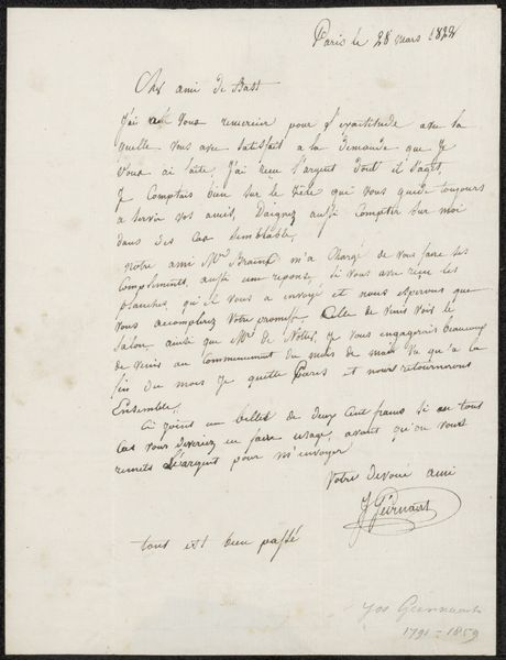 Curator: This intriguing artifact is entitled "Brief aan Philip Zilcken" by Alidor Delzant, possibly created sometime between 1900 and 1918. We can see that the artwork's primary materials are ink and pen on paper. Editor: It feels incredibly intimate, doesn’t it? Like eavesdropping on a private thought, even though it's a formal letter, really. The paper has aged so well too. I wonder who Phillip Zilcken was! Curator: Zilcken was an artist, critic and writer. So Delzant's letter acts almost like a proto-art review, or maybe even a bit of artistic advice amongst peers. What do you make of that use of the art medium in relation to labor and commerce, perhaps? Editor: Absolutely. You know, seeing the handwriting gives it such a personal touch. Like you are right there as his intimate peer. Can you make out if he is complaining? Maybe asking for feedback on a project? There's a real texture here, not just visual, but textural in what Delzant wants from the recipient of the message. It's not just about the finished piece but the back-and-forth of creating it. Curator: Yes! We see, thanks to the transcription, that the text seems to address suggestions and editing the volume by the receiver - "Faites des changements ou des coupures" meaning, "Make changes or cuts" and "Corrigez la ière épreuve et veuilly tours", meaning "Correct the first proof, if you please", emphasizing the process of creation as a negotiation. Also interesting how he advises readers only address themselves to reading Delzant's volume, only if those readers are willing to indulge an "infinite sadness". That is heavy emotional labour being laid on its readership! Editor: And it all circles back to Zilcken—this artistic dialogue where the raw product and experience, both creative and emotional, come together in such a tangible way. It makes you wonder about their dynamic! Curator: I think what stays with me is this sense of an almost casual instruction—businesslike, but personal nonetheless. This makes art feel accessible. Editor: For me, it is more so that it feels alive - a vibrant conversation across time, inked onto a fragile piece of paper.