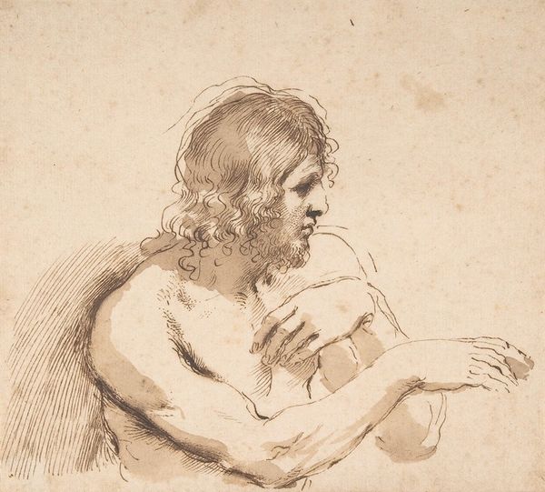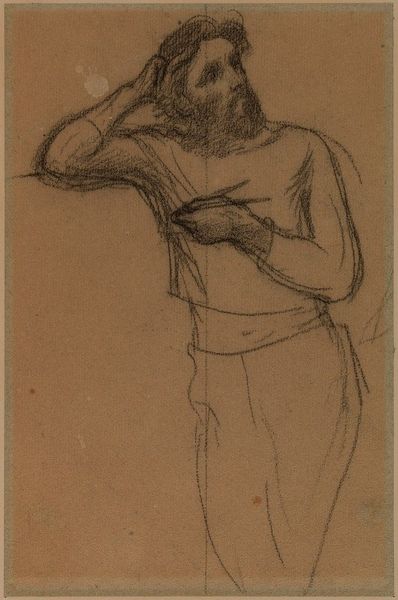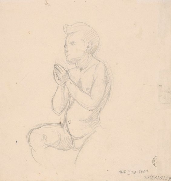 Curator: This is Frank Samuel Eastman's "Torso of a Male Nude," a sketch held by the Harvard Art Museums. Editor: It feels like a moment suspended—the figure gazing upwards, hands clasped. A fleeting, almost prayerful gesture. Curator: The artist seems preoccupied with line and contour here. The rapid strokes of the red chalk define the subject's form with an elegant economy. Editor: Indeed, the lack of shading amplifies the starkness of the figure's gaze, evoking a sense of supplication, a human reaching for something beyond. This is also an archetypal symbol, isn’t it? The "male nude" is such a loaded term, bringing to mind so much cultural memory. Curator: Precisely. Consider how that upward gaze has been employed across centuries—from Renaissance depictions of saints to Romantic era portrayals of the sublime. It speaks to both vulnerability and hope. Editor: It is the vulnerability that strikes me most. The raw emotion, captured so simply. Makes one wonder what the artist hoped to convey. Curator: Or perhaps, what he hoped to find.