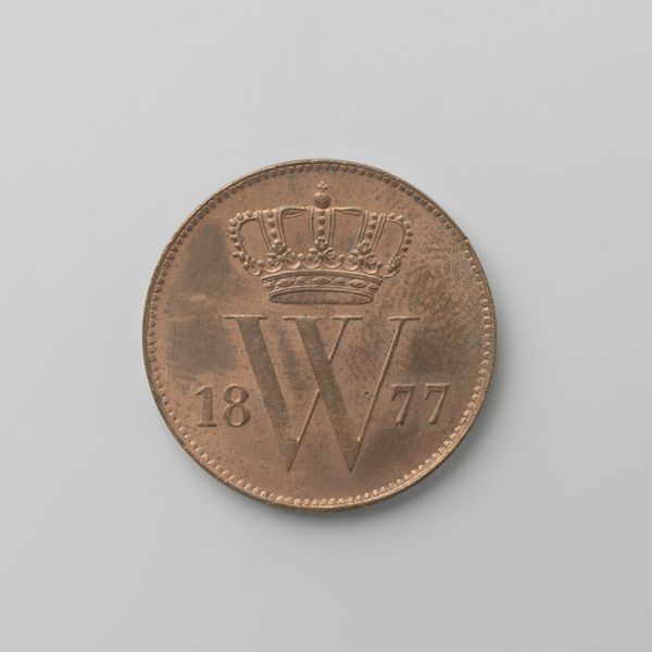 Editor: Here we have a Dutch half-cent coin from 1859. It’s a humble little thing, but carries the weight of a monarch and an empire, with the stylized "W" for Willem III and a crown stamped right on its face. What speaks to you when you look at it? Curator: This coin offers a powerful glimpse into the intersection of artistry, labor, and societal power structures. Consider the material itself: base metal, likely chosen for its durability and affordability, reflecting its intended circulation among the working class. Editor: So the material already speaks to its function? Curator: Precisely. It's not just currency; it represents labor exchange. The act of minting these coins involved specialized craftsmanship, demanding specific skills. Who were these workers, and what were their conditions? Moreover, the image impressed upon it – the king’s initial, a symbol of sovereignty – serves to legitimize and reinforce existing power dynamics with every transaction. Do you see it as propaganda? Editor: I hadn't really considered that. So every purchase, no matter how small, was tacit acceptance of the monarchy? Curator: Potentially. The constant handling and exchange would have subtly imprinted those values onto its users. Think of the coin’s journey: from the mint, through countless hands in markets and shops, funding both everyday needs and large-scale industrial projects. Editor: It’s incredible how much information is embedded in something so small. Curator: Indeed. And it urges us to challenge this coin's traditional boundaries – it transcends a mere monetary object; instead becoming a study of labor, power, and consumption woven together. Editor: Seeing it this way gives me so much to think about. I’ll never look at pocket change the same way.