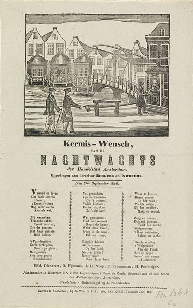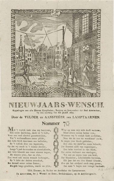 Editor: This is "Kermisprent van de lantaarnopstekers van Amsterdam voor het jaar 1846," an engraving from 1846. The artist is anonymous, and the print is held at the Rijksmuseum. It depicts a scene of lamplighters in Amsterdam. What particularly catches my eye is how detailed and almost architectural the printmaking is, despite the seemingly mundane subject matter. What do you see in this piece? Curator: The print is compelling from a Formalist perspective due to its sophisticated use of line and the implied depth created through meticulous shading. Note the strategic placement of the lamppost in the composition. It’s almost a semiotic anchor, bisecting the pictorial space and guiding the eye through the various planes of action. How do you see this element working to create rhythm, or perhaps a visual puzzle for the viewer to solve? Editor: I see the lamppost both divides and connects. It visually anchors the foreground while the lines of the buildings and the street draw my eye deeper into the cityscape. Curator: Precisely! The rigid geometry of the buildings contrasted against the curved lines of the lamplighters' movements is another interesting compositional choice. Consider the materiality of the print itself – the texture of the paper, the density of the ink. How does the very essence of the print as a medium affect its message? Editor: I hadn't considered that deeply before, but I see how the texture lends a historical weight and emphasizes the craftsmanship involved. Curator: Exactly. The starkness, due to the contrast between black ink and white paper, lends the image a sense of austere beauty and allows the detailed line work to take center stage. Did our conversation give you any other ideas or inspiration to think about? Editor: Yes definitely, I had previously only glanced at the artwork’s narrative, but now I will try to engage more thoroughly with its materials and artistic intentions.