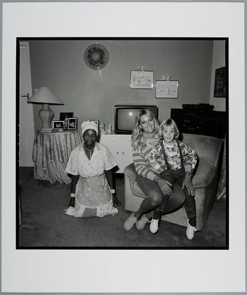 Curator: Here we have Milton Rogovin's 1978 gelatin-silver print, "Doris McKinney at Home, Republic Steel," from his "Working People" series. Editor: What strikes me immediately is how this monochrome image achieves such texture—look at that bold, patterned wallpaper and the varied surfaces of the clothing. It’s an incredibly intimate portrait. Curator: It really is. Rogovin dedicated much of his career to documenting the lives of working-class families, particularly those in industrial sectors. The "Working People" series aimed to offer visibility to the lives and environments of these laborers beyond their role in production. Editor: That commitment is so important, and visible. One senses it isn't just about depicting Republic Steel as a workplace. Rogovin captures the family’s private life, the interior space carefully curated with personal items – trophies, plants, pictures – all elements reflecting the family’s values and history. What I also wonder, materially, are those specific objects manufactured and sold, or custom-made items cherished by the family? Curator: That is precisely where Rogovin's artistic project opens a space for the recognition of the domestic as the stage where broader struggles play out. Republic Steel certainly marks this family's life, placing the labor practices and corporate culture in a dialogue with this home, this very wallpaper you identified. Editor: It is a space that is decidedly of the Black Arts Movement. Rogovin creates visual testaments celebrating the interior lives of African-American working-class families with social realism, providing an alternative to dominant representations, actively pushing back against racist depictions. Curator: Rogovin's approach raises important questions about representation, about whose stories are told and how. He's giving agency to his subjects, countering prevailing stereotypes with nuanced, personal narratives. The series challenges institutional invisibility by embedding his sitter into art history. Editor: Indeed. It goes beyond simply 'showing' – it insists on seeing. Rogovin has created such a lasting monument to Doris Mckinney's work, endurance and care. Curator: By putting faces and lives to a particular historical moment in the context of industrial production. It also speaks to art's responsibility. It reveals how we can reassess social issues with such carefully staged intimate settings, where people pose and work for and with the artist in their private spaces. Editor: This photograph asks us to look at how we connect these representations with how we live our own lives.