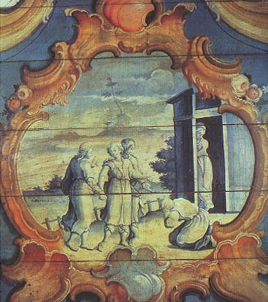 Curator: Immediately, what strikes me is the muted palette. It's aged, of course, but also evokes a sort of faded grandeur, a sense of mythological distance. Editor: And that ties in beautifully with its neoclassical roots. This fresco, "Tethys Immerses Achilles in the Waters of the Styx" by Francesco Hayez, dates to 1817 and currently resides at the Museo Correr in Venice. It captures a pivotal moment from Greek mythology. Curator: Absolutely. It depicts Tethys, a sea nymph, dipping her son Achilles into the River Styx to render him immortal, except, famously, for his heel. Looking at it, though, it's impossible not to think about anxieties surrounding masculinity and vulnerability. What does it mean to forge invincibility through such a dependent act, overseen by the feminine? Editor: I see what you mean, especially when considering how frescos were produced and situated, their purpose was to instill values, cement narratives in these noble villas. Consider the fresco as an object – a layer of pigment bound by plaster. The labor intensive method used here. The act of its making mirrors the tale itself – the binding, layering and material embedding mirroring the act of securing Achilles’ immortality. Curator: And even within the narrative of Achilles, we can read that act through an intersectional lens. Tethys is trying to protect him, but also denies him something: a lived, vulnerable experience, one accessible to mortals. The painting presents it as this sacrifice, but perhaps she inadvertently robs him of a fuller identity? Editor: I agree. But perhaps the very making and physical labor embedded in the materiality pushes towards a nuanced dialogue, Hayez working this into the space between grand ideals and daily applications in society. These things had an immediate cultural use and value. Curator: It all connects – the myth, its material depiction, and the ongoing conversations surrounding power, vulnerability, and how those are assigned along lines of gender. These classical stories never stop resonating precisely because these power structures continue to exist. Editor: Ultimately, Hayez gives us a look at the layers beneath that marble veneer. And these materials, in their very persistence and physical presence, offer avenues toward fresh insights, don’t they?
