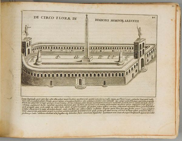 Curator: This is Giacomo Lauro’s print, "The Circus of Nero," currently residing in the Harvard Art Museums. It depicts the site of Nero's circus in the Vatican. Editor: It strikes me as very ordered, almost regimented, yet there's a dynamic energy conveyed through the racing horses within that rigid structure. Curator: Indeed, the circus itself is heavy with symbolic weight. The obelisk, for instance, stood as a silent witness to both the games and the martyrdom of early Christians. Editor: The composition clearly emphasizes the architectural layout, highlighting the formal elements. Note the sharp lines and the meticulous detail given to the colonnades and buildings. Curator: The space evokes not just spectacle but also profound suffering. The Circus became a site of Christian persecution under Nero. Editor: It is a very compelling composition. I wonder about the intended audience and reception of the work. Curator: Considering the historical context and the layered meanings embedded within the image, I find Lauro's representation to be really powerful. Editor: The print offers a cooly detached presentation, a compelling contrast to the brutal events associated with the space it depicts.