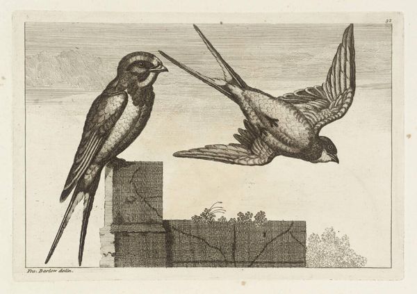 Editor: This print of a bird by Francis Barlow, held at the Tate, is quite charming in its simplicity. The bird almost looks like it's posing. What's your take on it? Curator: It's fascinating to consider the role images like this played in the burgeoning scientific illustration tradition. How did the artist balance observation with artistic license, and for what purpose? Editor: That's interesting, I hadn't thought of it as scientific. So, it's less about the bird itself and more about its representation? Curator: Precisely. Consider how prints like these circulated and shaped perceptions of the natural world. Was it meant for scientific study, or for a more general audience interested in expanding their knowledge? Editor: That really broadens my perspective on this piece. Thanks! Curator: A pleasure! Considering the historical context enriches our understanding.