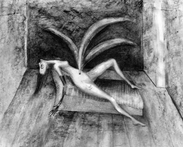 Editor: So, here we have "Narodziny dźwięku" – "Birth of Sound" – a 2019 charcoal drawing by Lech Jankowski. It has this unsettling, almost dreamlike quality with a figure observing what seems like a giant on a...table? What do you make of this intriguing piece? Curator: Intriguing indeed. To me, it feels like a visual poem, where the stark charcoal lines create a sense of tension. Look at the juxtaposition of the small, seated figure – almost burdened – against the oversized form above. It whispers of power dynamics, of unseen forces looming. Does it remind you a bit of Kafka, that slightly unsettling, absurdist tone? Editor: I see what you mean. It does have that eerie vibe. And the table – it's like a stage, or maybe even an operating table. The figure looks… detached? What is that instrument on the table – could it represent something specific, in the work, and title? Curator: That’s precisely the intriguing question. The title, “Birth of Sound,” alongside that unusual saw-like instrument suggests creation, a beginning perhaps, but maybe one fraught with difficulty. Perhaps the seated figure is an observer to that difficult birth, a midwife of sorts, but hesitant and unsure? Editor: So it is about birth and origins... But whose origins are we talking about here? Or is the "sound" something metaphorical? Curator: Precisely, it invites that open interpretation. It doesn’t spell everything out, does it? And, in the best art, that's precisely what keeps us engaged, mulling over its layers long after we’ve left the room. Editor: I hadn’t considered it that way! Seeing it as a kind of birth narrative adds a whole other dimension. Curator: Absolutely. Art’s all about expanding the echo chamber of our minds, isn't it? Finding new resonances and questioning old assumptions.