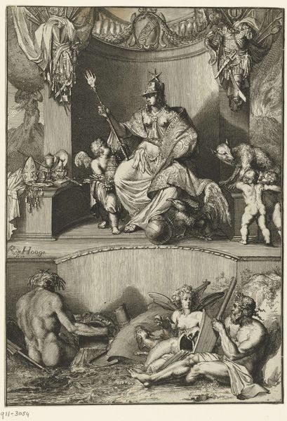 Editor: So, this is "Allegorie," created by François-Nicolas Chifflart, sometime between 1845 and 1901. It’s currently housed in the Metropolitan Museum of Art. It’s a print, I think an engraving. What strikes me is how the central figure seems both powerful and detached amidst all this chaos. How do you interpret this work? Curator: I see a compelling study of power dynamics, couched in allegorical language. Notice the female figure enthroned – a queen, perhaps, or an ideal – wielding a pointer, a symbol of control or direction. The figures surrounding her, in various states of supplication or despair, represent the collective will, molded – or, perhaps, oppressed – by this guiding hand. Editor: Oppressed is a strong word. It seems to me more like, being led, or at least watched over, like supplicants, as you suggest. Do you see a particular cultural context at play? Curator: Certainly. Consider the period in which Chifflart was working: the 19th century, a time of revolution, industrial upheaval, and burgeoning nationalism. The figures may symbolize different political persuasions, competing interests, all seeking favor, all vying for power under this central symbol, maybe of Justice. Editor: The faces in the crowd are really quite something. Very emotive! Curator: Yes, note how the artist renders those faces with such grotesque exaggeration, suggesting perhaps the baser instincts driving the collective. Editor: Now that I look again, that small plate beneath the central figure. Those do look like spoils. This piece is much darker than I first thought. Curator: The devil, as they say, is in the details, revealing truths through symbol. What’s the greatest symbol this speaks to, in your view? Editor: Well, after our chat, I think that "Allegorie" acts as a timeless reflection on the complexities of influence and authority and who gets the spoils of authority! Curator: Indeed. Art, like this, can transcend time, resonating with our own experiences of power and purpose.