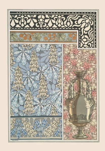 Curator: Let’s turn our attention to "Pissenlit 3", a print by Maurice Pillard Verneuil dating back to 1896. The work showcases several Art Nouveau patterns in a single composition. What are your initial impressions? Editor: My eye is drawn to the visual layering, these contrasting palettes—from the earthy reds to cool blues—give the piece an unexpectedly dynamic feel. There’s also a distinct asymmetry, preventing it from becoming purely decorative, almost unsettling the design in a way I enjoy. Curator: I agree. And it’s important to place this work within the context of the late 19th century and the rise of Art Nouveau. Verneuil, along with other artists of the time, were pushing against industrial production, seeking to bring beauty and nature back into everyday life. He designed many repeating and alternating textile patterns using stylized, natural forms. Editor: Which speaks to this wider movement against standardization of visual styles! Verneuil challenges the rigid constraints on design, and pushes to democratize art through decorative, mass-producible designs for everyone. You see this with textile design in general: creating accessible works is not antithetical to complex artistic or political thought. Curator: Exactly! His works served as accessible guides for others, with design after design being offered to wallpaper and textile factories alike. Now the social implications for women, especially lower class, of this mass production shouldn't be glossed over... but on it’s face, the patterns offer more aesthetic beauty. There’s a clear emphasis on flattened perspective and curvilinear forms here, characteristic of Art Nouveau's move away from academic traditions. Editor: It almost serves as a kind of radical statement then! Challenging artistic hierarchies that privilege painting, perhaps reflecting shifting social norms during an era of intense change for working class peoples' lives. To me, it brings up how even ostensibly 'decorative' art like this design for print can become intertwined with discourses of access, taste, and class struggle. Curator: Absolutely, and it's precisely those kinds of tensions and dialogues that make this artwork so rich for analysis. Thank you, this conversation opened so many historical insights for me. Editor: Thanks to you as well, your explanation framed its cultural moment with detail I never would have picked up on!