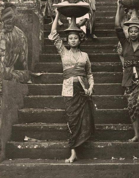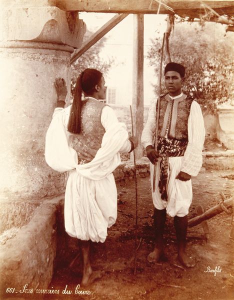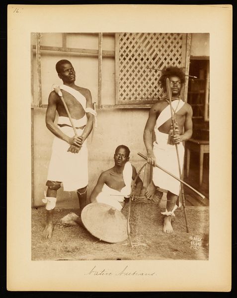 Editor: This gelatin silver print, "Les Femmes Malgaches" by Désiré Charnay, was created in 1863. The stark contrast between the figures and the background creates an arresting composition. I'm curious about your interpretation of this work, considering its visual elements. What do you see in this piece? Curator: The tonal range, varying from deep blacks to faded grays, constructs the image's architecture. Note how the subjects are placed against the linearity of the planks that constitute the structure in the background. Do you observe how this emphasizes the volume and geometry inherent in the figures? The contrast articulates the details of form. Editor: I do now! The texture of the wood seems to create a stage almost for the figures. What can you tell me about the way they are placed in this "stage?" Curator: The spatial organization, specifically the relationships between figures, is important. There’s a central figure with the others flanking. The lines and forms converge, leading your eye throughout the composition. It's almost sculptural in its presentation of mass. I see it less as stage and more as a cohesive arrangement. The light creates shadows on the faces. Notice that the directionality focuses one's view on the subject’s gaze and invites introspection. Editor: So, beyond representation, you are more interested in the composition's internal mechanics? Curator: Precisely. This emphasis, in turn, helps the viewer to more freely contemplate the interplay between light, shadow, and texture without prescriptive narrative burdens. Editor: I’m struck by how a seemingly straightforward portrait can offer such richness through a formal lens. Curator: Yes, paying close attention to formal elements can unveil layers of intention. I now realize the power and depth in understanding historical photography as simply visual presentation and arrangement.