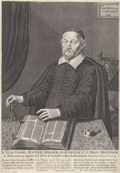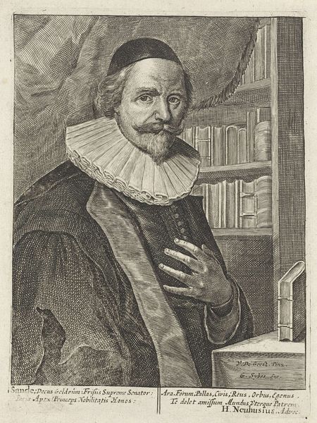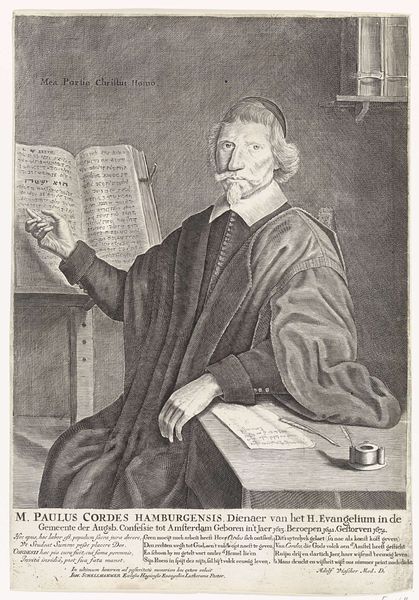 Curator: What immediately strikes me is the intensity of this image. There’s such concentrated focus in his eyes. Editor: Indeed. We’re looking at an engraving, an intaglio print actually, entitled "Portret van Johannes Schade van Westrum." The print was made between 1665 and 1686 and features the likeness of Johannes Schade van Westrum. Curator: That crucifix is quite imposing, looming behind him like that. Given your interest in social history, do such images tell us much about the man's faith and the culture of that time? Editor: Absolutely. This image serves to locate Johannes Schade van Westrum not just as an individual but as a figure within the very particular socio-religious structures of his era. Note the books, and the clerical garments. Curator: Right, his vestments point to a role in the church and theology as do the books. But I wonder about the positioning of the book he’s actively reading versus the stack. There is a visual emphasis on the revealed and the yet-to-be-revealed. Editor: A fine observation! In its way, this portrait actively shapes public perception. Portraits of prominent citizens such as this would have served a very distinct purpose in shaping their reputation. They would be hung for people to see, thus serving to make him a moral and intellectual example. Curator: The weight of tradition—you really get that sense here. Even his clothing, such thick, heavy fabric. The burdens of learning, the weight of the cloth. Editor: The artist, Jonas Suyderhoef, understood the visual cues of power and status in Baroque portraiture very well. Curator: Thank you. Seeing this print has renewed my appreciation for how portraits both reveal and carefully curate a certain message for posterity. Editor: Agreed, it is an intriguing example of how artistic practices shaped public perception in early modern Europe.