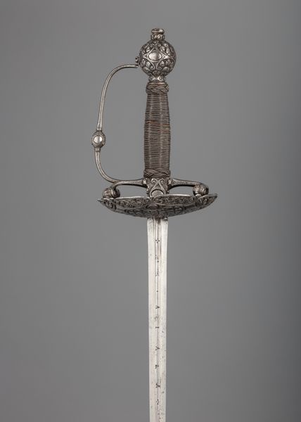 Curator: What a fascinating piece! We're looking at a Smallsword, crafted around 1815. It's currently held in the collection of the Minneapolis Institute of Art. Editor: The image gives a first impression of remarkable refinement. The hilt's silver finish has intricate fluting that’s just… soothing, almost meditative in its precise repetition. Curator: Indeed. This type of sword was typically part of a gentleman's attire during that period, signaling social status more than practical combat ability after, say, the 1780s. Owning it was less about knowing fencing and more about demonstrating wealth and adherence to societal norms, which still reflected rigid class systems. Editor: It's fascinating how its elegance speaks volumes despite its potentially violent purpose. See the detail in its knuckle guard, how the silver loops create an interesting dynamic. The hilt seems designed as a composition in balanced forms. Curator: The materials contribute to its display value too, of course. Combining steel with silver added to the cost of creating such weapons. It could be considered a form of performative consumerism or as a type of investment in self-promotion. Wearing such things showed an appreciation of craftsmanship as well as an intention to impress observers within public settings like theater events or balls. Editor: What does the ornamentation on the blade itself suggest? To my eye, it's far more organic and wild than the crisp, classical order on display elsewhere in the handle. Curator: Good observation! The designs engraved on the steel introduce a more fluid contrast with the rigid silver details on the hilt; likely motifs that connected its owner with stories, myths or ideals accepted within social gatherings. Smallswords like this became talking points beyond combat situations – projecting aspirations and worldviews along with the man carrying it. Editor: Seeing it in this light does enrich the meaning. The juxtaposition between controlled elegance versus wild adornment gives me reason enough alone for thoughtful reflections on society then and how aesthetics intersect with displays of identity and purpose today! Curator: It really does, it becomes an emblem. To delve into such details illuminates connections between art, daily lives, plus prevailing societal trends woven so intricately through objects. I appreciate your reflections.