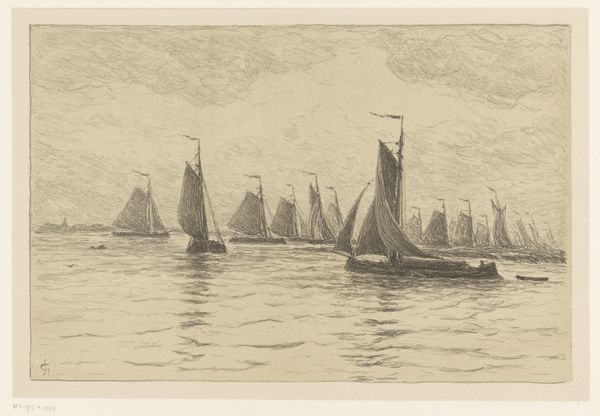 Editor: We’re looking at "Three Sailing Boats on the Maas near Dordrecht" by Carel Nicolaas Storm van 's-Gravesande, created between 1889 and 1902. It’s an etching, currently held at the Rijksmuseum. The detail achieved with etching is impressive – it feels quite intimate. What stands out to you as a historian of art? Curator: It’s interesting to consider this work within the context of late 19th-century Dutch art and its relationship to maritime power. The image is seemingly benign—three sailboats, beautifully rendered, on the Maas river. However, seascapes have always carried significant weight, often reflecting a nation's economic and political power. Do you see any suggestion of commerce or industry? Editor: I don't see obvious signs of commercial activity; the boats seem almost leisurely, perhaps for fishing, not large-scale trade. Curator: Exactly. And this is precisely the point. Unlike the grand, heroic seascapes of the Dutch Golden Age, which often depicted bustling trade routes or naval dominance, this print offers a more subdued, perhaps even nostalgic, view of Dutch maritime life. The etching process itself allows for incredible detail, drawing the viewer into this almost private moment. Considering the rising industrialisation at the time, what do you think the artist is telling us by representing the traditional sailing boat? Editor: I hadn't considered that it could be about rising industrialisation. I now read the artwork as representing a shift from the traditional activities of Dutch life to the dawning of industrial changes. Curator: Indeed. Van 's-Gravesande perhaps aimed to evoke a sense of a world on the cusp of change. The public consumption of such imagery highlights the changing identity of the Dutch and the romanticization of traditional ways of life during modernisation. It reminds us that art is never truly divorced from the socio-political forces of its time. Editor: That’s a very insightful point. I am now considering how artistic representations like this influence public perception of societal shifts, so thank you for that.