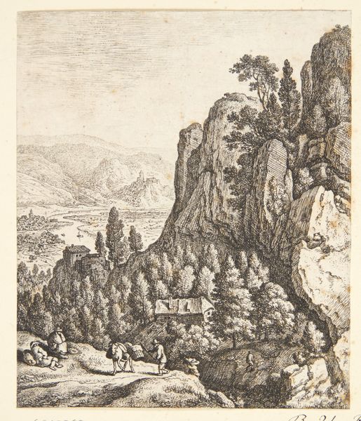 Editor: This is Herman Saftleven's "Rhine Landscape with a House at the Base of a Cliff," a small etching. It feels like a romanticized view of nature, but the figures seem burdened. What do you see in this piece? Curator: The Rhine River was a site of both idyllic beauty and intense commercial activity. Saftleven presents a tension there. Who benefits from this romanticized landscape? Are those figures laboring so that others may enjoy this view? Editor: That's a powerful point. It makes me reconsider the figures within the composition. Curator: Exactly. And how does this image reinforce or challenge existing power structures related to land ownership and labor? Editor: I hadn't thought about the social implications of landscape art before. Thank you. Curator: My pleasure. It's about looking beyond the surface.