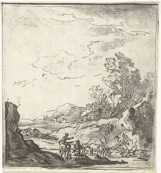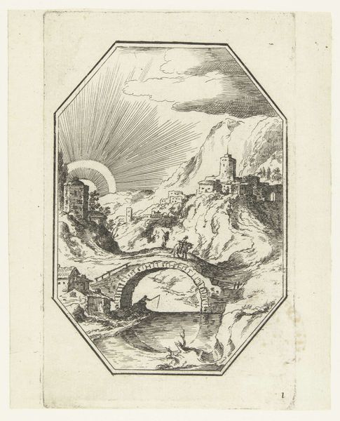 This is an anonymous etching and engraving from the Netherlands depicting a landscape with a shepherd, framed in an octagonal border. In the absence of a known artist, it is worth looking at the context in which this image was made. The work is part of a larger series, and series like these were usually made for albums, prints or books. The Dutch Golden Age in the 17th century saw a flourishing market for landscape paintings, and prints like these would have catered to a growing middle class, eager to display their wealth and taste for art. The octagonal frame itself is an interesting feature that suggests an awareness of current trends in art and design. The presence of a shepherd in the scene evokes classical pastoral themes, but it also fits into a broader cultural context of a society that depends on agriculture and trade. To truly understand this piece, we would need to research the publishing and printmaking industries of the time.