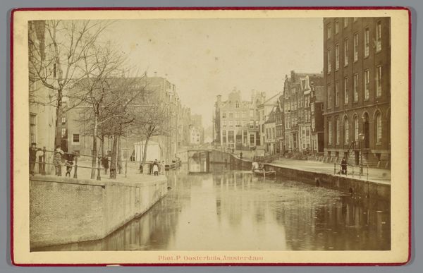 Curator: What strikes me first is the uniformity, even severity, of this photograph. The buildings lining the canal are almost oppressively ordered. Editor: Indeed. What you're seeing is an albumen print, likely dating between 1850 and 1900, showing a "View of the Singel in Amsterdam between the Spui and the Heiligeweg." Curator: Thank you. Beyond its representational content, observe how the photographer has mastered the orthogonal planes receding into space. The sharp angles and geometric precision serve to define not only spatial volume but also an implicit hierarchy. Editor: I see that, but the implicit hierarchy is social and political, not just aesthetic. These canalside houses would have belonged to wealthy merchants and ruling elites, visibly setting them apart from the working classes. The almost ethereal depiction, with its tonal subtleties and muted colors, seems to veil the harsher realities of class division and the labor on which this affluence depended. The composition reinforces the authority of this built environment. Curator: An interesting point. I appreciate the image's interplay of light and shadow; notice how the reflections on the canal's surface seem to dematerialize the structures, creating a double exposure within the photographic plane. Semiotically, the repetition suggests both stability and transience, creating a nuanced reading. Editor: The photograph isn’t merely recording history. The staging of these men by the canal hints at power structures as well. What we perceive is the solidification of capital presented through architecture. This connects directly to land ownership, class divisions, and social dominance—it speaks of how a particular worldview became imprinted upon the cityscape itself. Curator: Even still, one can't ignore the formal perfection of this composition. Editor: Though beautiful, we cannot divorce aesthetic appreciation from a critical interrogation of whose realities are centered, and whose are obscured. Curator: A powerful reminder. Thank you. Editor: You as well.