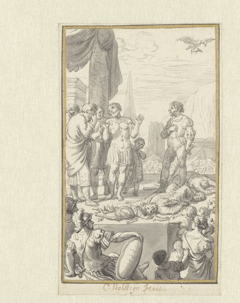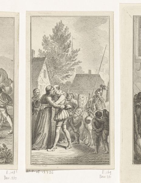 Curator: Here we have Daniel Nikolaus Chodowiecki’s 1775 etching, "Don Quichot helpt de van haar ezel gevallen boerin," which translates to "Don Quixote helps the farmer’s wife who fell from her donkey," housed right here at the Rijksmuseum. Editor: Immediately, I get a sense of staged drama. There's a delicate balance, or rather imbalance, of humor and seriousness. The fallen woman and the assisting Don Quixote have me picturing some comedic Baroque street theater. Curator: Chodowiecki was, of course, working within the traditions of Baroque art, particularly its emphasis on capturing dramatic moments, but there's a unique twist here. He really captured a moral narrative as he had in much of his oeuvre. Don Quixote, known for his idealism, rushes to assist someone, a simple act that reflects Enlightenment values and social commentary of his day. Editor: Right, but also a dash of madness. I mean, look at the almost manic energy in Quixote's posture versus the woman who's just sprawled out in a moment of pure, unglamorous chaos. Is it helping or meddling? This feels so current! It has you wonder, does doing good always require some self-deception? Curator: Ah, the eternal question of intent versus impact! Chodowiecki leaves that beautifully ambiguous. The small format print like this one meant it was reproducible and could be distributed widely to promote new morals during the rise of print culture. These accessible artworks encouraged viewers to emulate kindness, or to see that such emulations are always somewhat absurd. Editor: In that regard it’s almost photographic, no? These little images capture these grand moral concepts so well, it almost makes you nostalgic for when enlightenment meant, well, something simpler! Curator: And I'm charmed by that simplicity. It allows a nuanced interaction with both literary and real world encounters with everyday compassion in a rapidly shifting European society. Editor: Definitely. For me, this little slice of narrative speaks volumes—about theater, reality, and how the simplest acts of supposed kindness might really just be elaborately masked follies. It seems even back then we loved staging our lives!