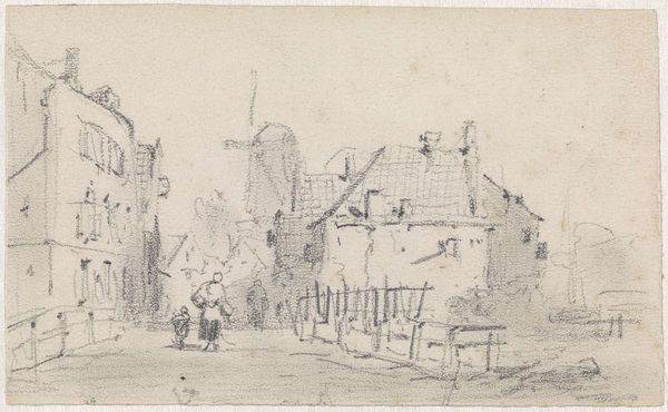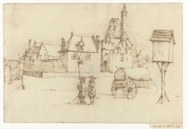 Curator: What a quietly intriguing little scene. There’s something so… personal about it. Editor: Indeed. We’re looking at "Binnenplaats van huis te Dieren," or "Courtyard of a House in Dieren," a drawing rendered in ink by Constantijn (II) Huygens, likely dating back to 1678. Huygens offers a glimpse into 17th-century Dutch life, and more broadly speaks to the history of the Dutch Golden Age. Curator: It feels almost like a memory, or a dreamscape. The spareness of the line, the light... it all contributes to a feeling of hushed stillness. And yet, you get the sense there were people here not long ago... Editor: The composition invites a reading that goes beyond the aesthetic experience you describe. I mean, yes, Huygens’ drawing does masterfully capture the quotidian. But consider the social hierarchies embedded in this "simple" courtyard scene. The architecture, though unassuming to modern eyes, symbolizes the economic stability and status of its inhabitants in their particular moment in history. Curator: Oh, absolutely, I see that too. But isn't there something profoundly human in focusing on these little domestic spaces? I keep coming back to that abandoned cart in the foreground... it’s begging for stories. Is it a pause, or abandonment? It feels like the possibility of change... the beginning of something, not the end. I love that little glimmer of hope amid so much ordinary reality! Editor: And what about the laborers whose work made such domestic tranquility possible? This tranquility and 'ordinariness' came at a price. So many people worked tirelessly—often unseen—to ensure that others could inhabit these spaces with comfort and leisure. A cart evokes all manner of questions about mobility, labor, and class. These Golden Age images so often depict a sliver of society and omit a larger socioeconomic reality that remains invisible to this day. Curator: Well, of course—there are multiple perspectives. But for me, this work reminds me of how profoundly art captures time, whether consciously or unconsciously. Editor: Precisely. This conversation serves as a perfect reminder of how essential multiple vantage points are in enriching our appreciation of art. Each viewpoint contributes to the collective historical consciousness to which all art implicitly belongs. Curator: Hear, hear.