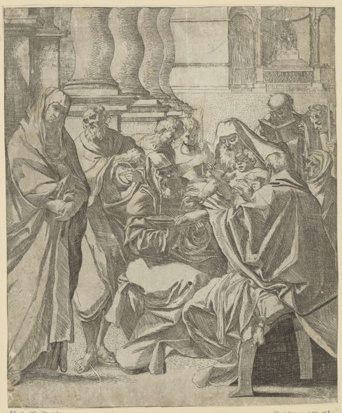 Curator: This engraving, titled "Judith with the Head of Holofernes", dates from around 1500-1520 and is attributed to the Monogrammist RR. What stands out to you? Editor: My first thought is just how brutal this scene is, rendered in such meticulous detail. The women exiting with Holofernes' head—it is chillingly well-defined. Curator: Indeed. Engraving, as a printmaking technique, allowed for distribution and widespread access. Consider the skill involved in producing this. Each line etched into the metal plate required intense labor, precision. What audience were they trying to reach, what impact would this image have had? Editor: And beyond the technical skill, think about the narrative. Judith, a Jewish widow, bravely enters the enemy camp and seduces Holofernes, the Assyrian general. Then she beheads him in his sleep, saving her people. This image plays into gender roles of the time and of how women had agency of their sexuality in wartime. A deeply troubling power dynamic in the scene that reveals the political power wielded by women under siege, then and now. Curator: Exactly, we see an allegory of the weak defeating the strong, a classic theme. How do we reconcile celebrating such acts of violence when enacted by marginalized people, considering both the power structures then and the reception of this engraving itself? It would have been circulated and sold to the masses; each of those individuals has to be accounted for. Editor: It forces us to confront uncomfortable truths. About how narratives of resistance are often intertwined with violence. The question then is who gets to tell these stories and to what end? Did this image serve to empower or exploit this moment? Curator: The artist has left us much to unpack. We've been confronted not only by this stark historical act of defiance but challenged in our very understanding of it in a different light. Editor: Precisely. It has broadened my understanding and given me so much more to explore beyond what’s visible at first glance. Thank you!