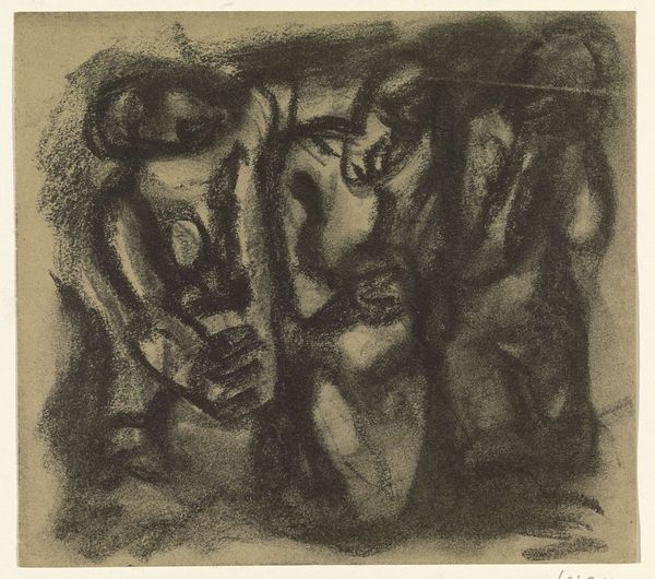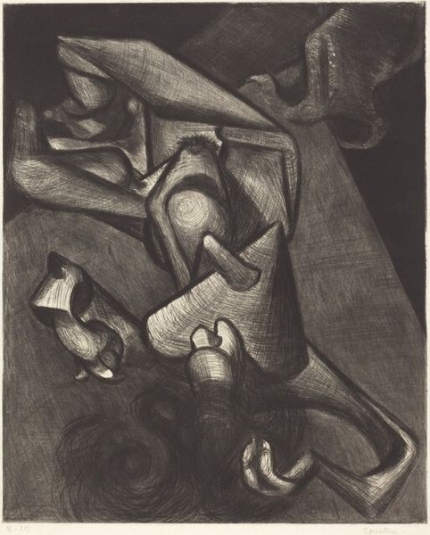 Isador Margoles made "Defiance" as a lithograph on paper. I can imagine him drawing directly onto the litho stone to create this image; the cross hatching feels intuitive, like he's almost scribbling, searching for the form. I’m drawn to the way the figures are packed together, almost claustrophobic. There's a real sense of weight and physicality, especially in the dense, dark areas of shading that define the figures. Look at how Margoles uses these marks to sculpt the figures, giving them a palpable, almost sculptural presence. You can almost feel the tension in the lines, particularly in the clenched fist raised at the top of the image. It's as if the very act of drawing becomes a defiant gesture. Margoles reminds me of artists like Kathe Kollwitz, in the way he conveys the struggles of ordinary people. Art becomes a form of solidarity, a way of bearing witness to the world.