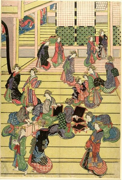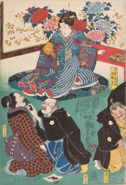 Editor: This woodblock triptych by Utagawa Kuniyoshi presents a scene brimming with figures in varied states of distress or glee. It is titled "Nambyō Ryōji" and resides at the Harvard Art Museums. What underlying narrative or cultural significance do you perceive? Curator: Observe how the central female figure, serene amidst the chaos, acts as a focal point. Note also the peonies behind her. Does this give you an impression of her status and role within the depicted narrative, perhaps reflecting a cultural ideal of beauty or power? Editor: It does seem to suggest a central, perhaps revered, role for her, given the surrounding disarray and her composed nature. Curator: Indeed. The arrangement of figures and symbols like peonies might signal a deeper story of social dynamics and perhaps commentary on healing, either physical or societal. What did you find particularly impactful about this piece? Editor: I now see how much detail is packed into the composition, making it more than just a pretty image. Curator: That's right. These prints are a window into the past.