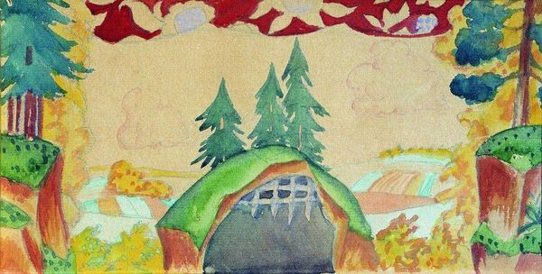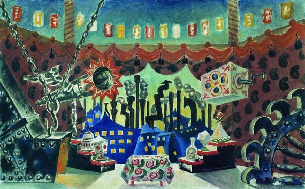 Curator: Here we have Boris Kustodiev's 1925 stage design rendered in gouache, entitled "Tula, Stage Design for E. Zamyatin's play, 'The Flea.'" Editor: My initial impression is one of delightful naivety. The color palette is vibrant, and the composition, though unconventional, radiates a certain playful charm, almost as if viewed through the eyes of a child. Curator: Indeed. This work encapsulates the avant-garde's experimentation, born in revolutionary Russia. It visually represents the theatrical piece "The Flea," which, through exaggerated characters and plotlines, critiques political opportunism and the societal absurdities that emerged during that turbulent time. The visual vocabulary employed allows Kustodiev to translate that satirical, critical viewpoint into visual form. Editor: I'm drawn to the stylized cityscape. The composition is undeniably flat, but it lends itself to a sort of intentional artifice, a calculated departure from representational accuracy that highlights the very nature of the artwork being a stage set design, blurring the boundary of illusionistic pictorial space with stagecraft. It's not just *of* a stage; it very consciously *is* one. Curator: And let’s consider the pointed referencing to "Tula." As a significant manufacturing centre, its industrial heart became the butt of many satirical jokes within Zamyatin's narrative. Kustodiev visually references folk-art styles to echo traditional storytelling that mocks established hierarchies. The intention being, art shouldn't simply entertain but challenge societal structures by representing counter narratives through visual signifiers. Editor: Yes, if we look closely, it feels like Kustodiev actively disregards spatial conventions, emphasizing planes rather than depth and reducing elements to almost cartoonish proportions; for instance, those bold outlines contribute to the image's graphic sensibility. Curator: By embedding folklore references, a shared Russian vernacular, Kustodiev attempts to involve his audience. The production isn’t merely a form of entertainment; it's an invitation into shared introspection concerning cultural identity when social progress and tradition appear to conflict. Editor: Agreed. Its persistent commitment to color and design transforms its potentially polemic tone to light-hearted visual feast. Curator: Examining art with close attention helps in understanding that artistic decisions made regarding visuals are far beyond mere stylistic preferences; they form powerful commentary upon how art engages wider ideological discourse. Editor: Precisely, and what an intriguing instance this painting offers.