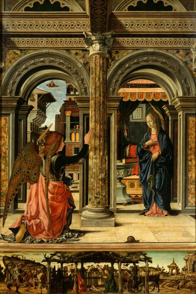 Curator: So, we're looking at Pietro Perugino's "St. Jerome who resurrected the bishop Andrea," painted around 1473. Editor: That's right. It's tempera and oil on panel, currently housed in the Louvre. There's something very still and formal about it, even with the supposed resurrection. It's like a tableau vivant. What do you make of it? Curator: The stillness is key. Consider the socio-political role of religious art at this time. Perugino wasn’t simply illustrating a miracle. He was participating in the construction of religious authority and solidifying its power structure. Notice the emphasis on hierarchical figures through clothing. What might the theatrical staging of this scene, in contrast to the gritty realities of illness and potentially dissenting beliefs, convey? Editor: So, it’s less about genuine religious experience and more about performative power? Curator: Exactly! Think about the patrons who commissioned such works. They often used these visual narratives to legitimize their own positions within the religious hierarchy. This painting doesn’t just tell a story; it actively *performs* a certain type of ideology that reinforced social hierarchies. What do you observe in the background and its architectural elements? How could it tie to our understanding? Editor: I hadn’t considered that. I guess the slightly awkward perspective, combined with the contained architectural space almost creates a stage, as you were implying, on which this scene plays out. It gives it a kind of forced, artificial feel. Curator: Precisely. By controlling the narrative visually, the Church controls the interpretation and therefore, the power dynamic. The artwork becomes a tool for upholding an uneven social structure, masked by spiritual transcendence. Editor: That's fascinating! It shifts my perspective entirely, seeing the painting as less a depiction of a miracle and more a careful performance of power dynamics. Curator: I am glad to hear it; this close looking has deepened my perspective on Renaissance art.