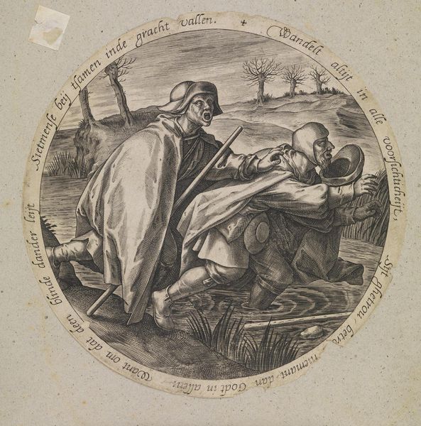 Battista Franco created this small engraving, "Religion Comforting a Poor Old Man," sometime in the mid-16th century. The print is dominated by the figures of a woman, representing religion, and an elderly man, set against a cloudy sky within a circular frame. The composition uses a stark contrast between the upright, flowing lines of Religion and the slumped, angular posture of the old man. The texture created by the engraving technique adds depth and a somber mood to the scene, while the use of light and shadow accentuates the figures' emotional states. Religion's raised hand and serene expression contrast with the man's desperate grasp and downcast gaze, creating a powerful tension within the small format. Franco challenges the traditional notions of power and comfort, using a formal arrangement to question the role of religion in society. The print invites us to reflect on how gestures and forms can destabilize established meanings and offer new perspectives on human suffering and solace.