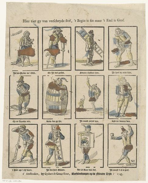 Curator: I'm struck by the straightforward nature of this print; it reminds me a little of a medieval woodcut in its style. Something about the clear lines against the creamy paper suggests old stories simply told. What do you make of it? Editor: It feels moralizing, doesn't it? We’re looking at an engraving dating, we think, from somewhere between 1767 and 1793. The title, printed at the top, reads: "Op rijkdom / eer / of 's warelds staaten / Mag niemand zig geheel verlaaten," which roughly translates to: "On riches / honor / or worldly estates / May no one rely entirely." Each little tableau offers a lesson. Curator: A cautionary one! Like little stages. The figures are neatly compartmentalized. A nobleman gestures grandly. A merchant hoards his coins. Each encapsulated within a little box, yet together hinting at life's transience, like a pre-Instagram morality reel! And below each figure, a pithy saying. They were obviously really working at democratizing visual communication even back then. Editor: It’s an interesting reflection on society's relationship with material wealth, really. Considering its distribution, accessibility—and perceived spiritual value, I wonder about its broader function at the time, how audiences used or read them… Where these affordable reflections to keep and put away in a family bible? What was its route, or market? Curator: Ah, the burning question for us historians: the "who, what, when, where, why, and how" of its cultural transit. Yet, as a creative I'm instantly thinking of a series of eight embroidered panels! Just thinking about it... eight interpretations of ways we are undone! Oh the possibilities of color. Editor: Ha! And for me I suddenly see this in contrast to more lavish prints, made for wealthier homes and audiences: as the era went on, more accessibly priced visual arts had potential for spreading a new socio-political conscience. Who knows if images such as these shaped ideas during those uncertain times, pre-revolution, too! Curator: It gives us a pause in reflecting about pre-cinematic storytelling, doesn't it? I do appreciate its message in being reminded to re-consider material and temporal investments. And as an artist, too, I see opportunities for reinvention! Editor: Indeed, quite so. Its historical implications regarding political impact are quite suggestive and valuable.
