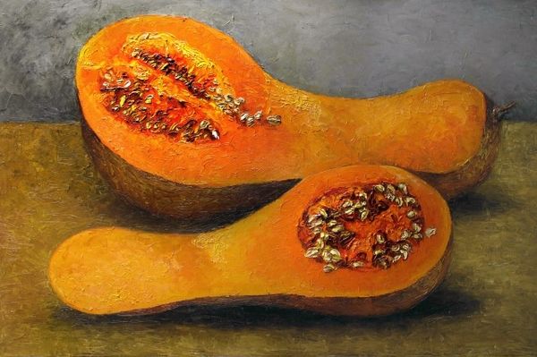 Editor: Here we have Alexander Roitburd’s "Squash," created in 2011. It's a vivid close-up of a halved squash, dominated by oranges and browns. The texture looks quite thick. What stands out to you about the composition of this piece? Curator: Note how the artist has handled the contrast between the smooth exterior and the fibrous interior of the squash. Consider also the seed arrangement: they are not haphazard, but possess a rhythm, echoing the form of the squash itself. Does this considered approach reveal anything about Roitburd’s aesthetic intention, do you think? Editor: It almost feels intentional, designed, maybe less about realism. Are you suggesting the formal arrangement outweighs a purely representational goal? Curator: Precisely. The artist isn't simply depicting a squash. Consider how the earthy palette is juxtaposed with the almost geometric segmentation of the two halves. Think about the line, the shapes, the color. It evokes a sense of organic, divided unity. Observe the tactile quality suggested by the paint handling. Editor: The impasto application does give it a three-dimensional feel, a physicality beyond just being a painting of a squash. Do you think there's an attempt at semiotic significance within this chosen depiction? Curator: It may allude to a visual dissection. What purpose does dissection serve? What might the intent of division expose? Note the darker and more shaded elements of the lower part in relationship to the brighter flesh of the cut squash. In effect, what does the artist imply about how internal structures compare and contrast? Editor: Interesting. I came in just seeing a squash, but I now notice all these contrasts and careful constructions I hadn't spotted. Curator: Yes, close formal readings allows for decoding the intent embedded within.