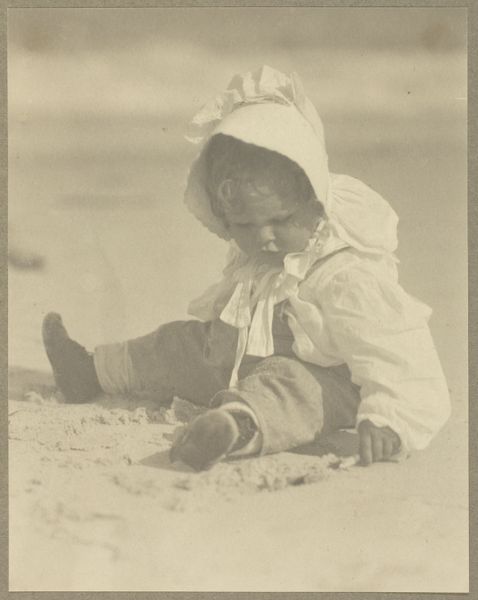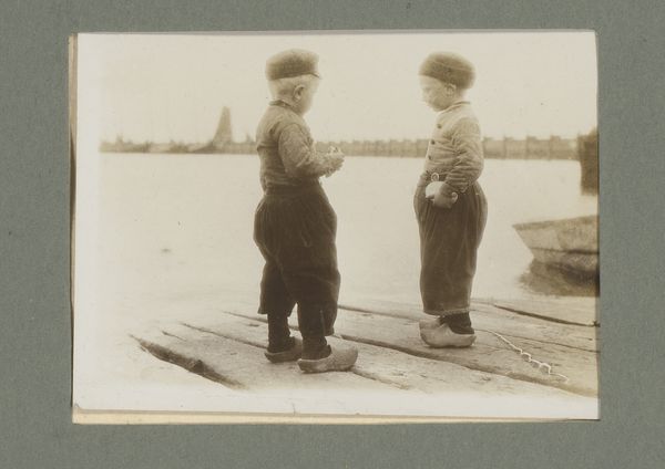 Editor: Here we have "Two Boys on the Beach at Scheveningen," a gelatin silver print from 1904. There’s something melancholic about the tones, almost like a memory fading. What strikes you about it? Curator: It’s a beautiful piece for examining the intersections of childhood, labor, and coastal communities in early 20th-century Netherlands. Note the wooden shoes. These weren't just fashion statements; they were practical footwear for working-class children, especially in fishing communities like Scheveningen. Editor: So, beyond a simple snapshot of two boys, there’s a commentary? Curator: Absolutely. The image subtly highlights the blurred lines between youth and the responsibilities thrust upon them. How did the burgeoning fishing industry shape the lives, and indeed, the identities, of children like these? What about gender roles? We don’t know what their lives look like but it is not a stretch to image some realities. The boat in the background isn’t just a scenic element. Editor: That makes me reconsider the mood entirely. It's not just nostalgic; it's questioning. Do you think that perspective was intentional on the photographer’s part? Curator: Intention is difficult to determine. But by examining social conditions and the symbolism embedded within the image, we can build narratives around representation, agency, and the complex realities of the depicted subjects. Editor: It's fascinating how much history can be packed into one photograph. I'll never look at old photographs the same way. Curator: Indeed. Art gives us entry points to larger narratives.