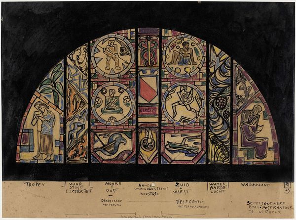 Wilhelm Süs created this design for a stained-glass window called, The Sun. Süs lived during a time of great social and political upheaval, and like other artists of his generation, he engaged with Symbolism. The allegorical figures here reflect that influence. The figures arranged in a semicircle above a central sun could represent different stages of life. However, while using the artistic language of symbolism, he also appears to challenge traditional representations. The nude figures, the family fleeing a dark abyss, and the laborers all point to a deep concern with the human condition. The smiling sun, surrounded by frolicking cherubs, suggests that even in the face of hardship, life holds promise. While the figures recall classical art, their placement and interactions offer a more humanist vision. Süs explores themes of hope and renewal through the universal symbol of the sun. The artwork thus reflects both the anxieties and aspirations of a society undergoing profound change.