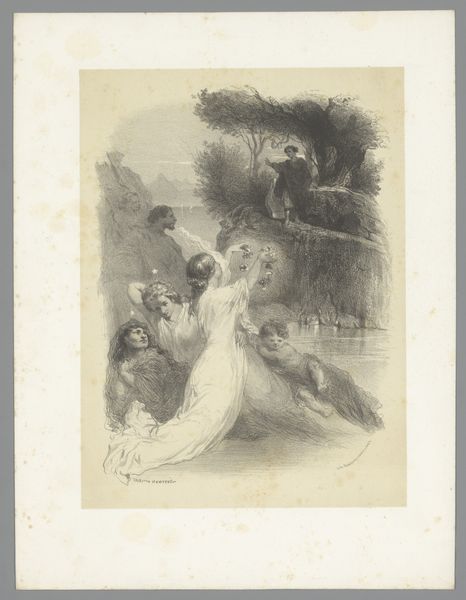 Curator: Welcome. Before us hangs a print attributed to Célestin Nanteuil, titled "Vrouw met paard, hond en bediende"—or "Woman with horse, dog and servant"—created sometime between 1826 and 1880. Editor: Immediately, I'm struck by the stark contrast between the dark, imposing figure of the woman and the rather subservient, almost caricatured depiction of the servant. It's a powerful statement about social hierarchy, even before we delve into symbolism. Curator: The composition is carefully arranged to emphasize that hierarchy. Observe how the woman, elegantly attired and centrally placed, dominates the visual space. The positioning of the horse and hound further accentuates her status, acting almost as emblems of her wealth and position within the society depicted. Note the textures achieved with the engraving technique. Editor: The dog, an elegant greyhound, appears alert but almost pleading, further underlining the themes of domesticity and dependence that permeate the image. The horse is interesting – almost spectral and relegated to the background. Its prominence is undeniable, a potent symbol. Curator: Precisely. The horse, often a symbol of power and virility, is here subdued, literally behind the woman and a subordinate, adding another layer to the representation of gender dynamics. In this Romanticist example, look closely at the detail given to the texture of the servant's clothing, compared to that of the mistress' fine, flowing dress. Editor: Absolutely. It almost feels like a scene lifted directly from a novel, with the woman as the stoic, central figure navigating a complex social landscape. I sense echoes of Austen and Brontë, don't you think? The racial aspect, I cannot ignore either. Curator: It’s certainly an example of its era, replete with societal commentary. However, stripping back the socio-historical interpretation, one can’t ignore the mastery with which Nanteuil balances light and shadow. The play of lines in the trees behind creates a sense of depth that pushes the figures forward, further highlighting the subject’s rigid stance and the formality within this piece. Editor: A formal study enhances the artwork. I find this depiction deeply resonant, echoing tales of power, control, and the often-uneasy relationships defining social status, played out on the stage of domestic life. Curator: Indeed, a piece that remains fascinating, both for its artistic execution and the cultural values it inadvertently reflects.
