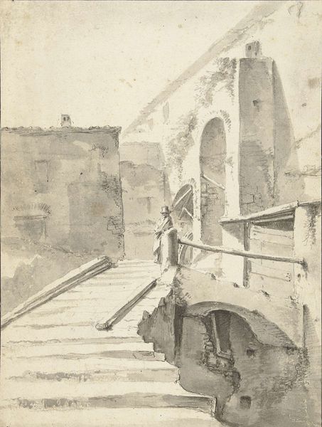 Editor: So, this is "Oude brug met woning of keldersramen onder de kade" by Kasparus Karsen, sometime between 1820 and 1896, using watercolor. It's… a bridge, some architecture. What really strikes me is how worn everything looks, the palpable decay. How do you interpret this work? Curator: Well, let's consider the materiality. Karsen's choice of watercolor is significant. It allowed for a certain speed and transparency, fitting for capturing the textures of aging infrastructure. The blurred edges speak volumes. Editor: You mean, it wasn't about making it perfectly realistic? Curator: Precisely. This piece isn't about precise architectural rendering, it's more about capturing the effects of labor and time on these urban structures. The subject of the piece focuses on something made by humans, something used by humans. What does that say? Editor: Maybe… that nothing lasts? Or maybe about how our lives impact our physical surroundings? Curator: Interesting. The fact that Karsen chose to depict the underbelly of the bridge is crucial. It spotlights the overlooked spaces shaped by industry and utility, often absent from idealized cityscapes. Editor: I hadn’t thought about the angle so much, but focusing on these areas below street level, it shifts everything. What was I even looking at before? Curator: It changes our view of urban existence by displaying that these locations exist. Through materiality and subject, the artwork underscores that the materials and production techniques are just as crucial as artistic skill. Editor: I see your point! Focusing on how things are made, and the process involved, gives us an entirely new way to interpret art, even a seemingly simple watercolor like this one.