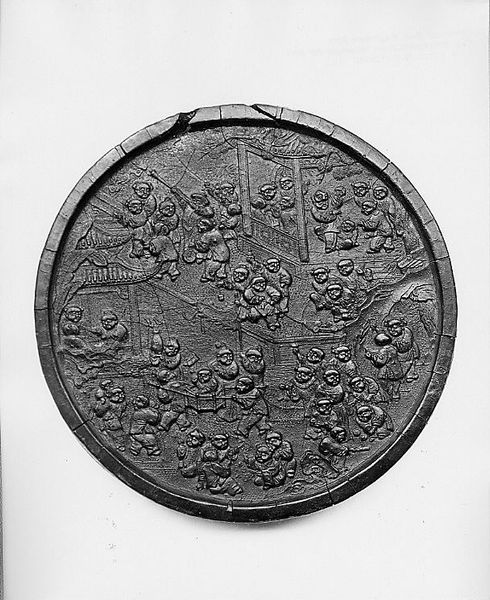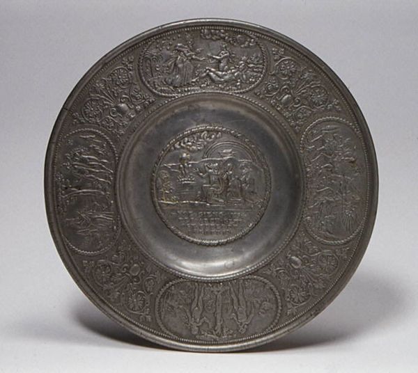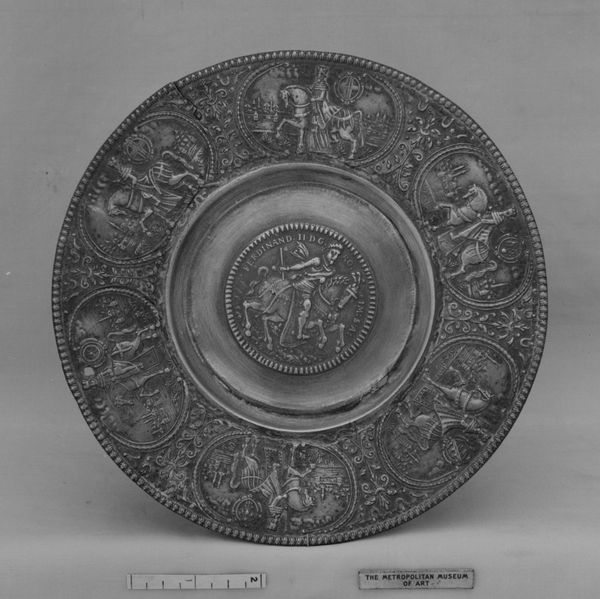 Curator: Here we have a Kaiserteller, a display plate dating from around 1632 to 1662. Paulus Öham the Younger is credited with its creation, and it’s a remarkable piece of metalwork currently residing at the Metropolitan Museum of Art. Editor: Immediately, I'm struck by the dynamism. The repeating circular patterns are neatly contained by that beautiful twisted border. Curator: Indeed! Notice how the circular fields encircling the plate's center contain figures on horseback, images of knights charging that allude to heroic themes and nobility, drawing upon familiar medieval symbols of chivalry and power. Editor: Yes, and the way Öham varies the relief in each section creates an interesting visual rhythm. The central medallion appears shallower in contrast to those deeply carved vignettes in the surrounding border, and is framed to command attention. Curator: Those images speak volumes! Each character is meticulously cast and arranged to reflect an elevated status, mirroring historical power dynamics. This plate clearly served not as mere dinnerware, but as a representation of prestige. It would have undoubtedly sparked awe. Editor: Agreed. The use of metal as a medium gives the piece a sense of permanence and importance, while the monochrome color scheme keeps the emphasis firmly on the composition and form, each element finely wrought. You sense that every swirl is deliberate. Curator: Precisely. It captures that sense of self-assuredness of the aristocracy. You see in the faces a belief in the divine right of kings and an obsession with legacy, something to show your wealth. Editor: Considering its intricate details and skillful execution, the plate certainly embodies the refined tastes and the sophisticated artistry popular during its era. Curator: Absolutely, a compelling study in history and craftsmanship right before our eyes. It reflects not just aesthetics but also profound socio-political messages prevalent centuries ago. Editor: I'm walking away thinking about the level of intricacy and intention; the plate is dense with it, making you pause and consider not only how beautiful it is but why.