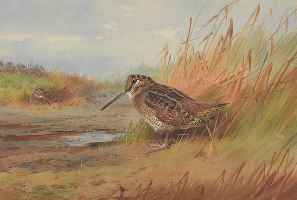 Editor: Right, let's talk about this beautiful watercolour and coloured pencil drawing, "Pectoral Sandpiper" by Archibald Thorburn. I'm immediately struck by the dynamism; it feels like we're right there, sharing the sandpiper's moment of flight. What details stand out to you in this piece? Curator: Ah, isn't it lovely? Thorburn really captures a sense of wildness, doesn’t he? It's like a snatched glimpse into a private world. What tickles my fancy is the tension he creates. It’s almost as if time has been suspended—the bird caught mid-action. Look how he uses colour; that quiet palette reflects the bird's environment so beautifully. The light seems to shift as you move closer... Do you sense that, too? Editor: I absolutely see that. It's quite immersive! Almost like a photograph but with the added charm of the artist's hand. Were these kinds of nature studies common at the time? Curator: Indeed, there was a huge surge in ornithological art around the late 19th and early 20th centuries, wasn't there? A reflection, I reckon, of the burgeoning interest in natural history, and perhaps a nostalgic longing for the unspoiled countryside. Imagine the artist out there, braving the elements, notebook and pencils in hand, utterly absorbed. Don’t you just want to join him? Editor: It paints a lovely picture! This conversation has really opened my eyes to appreciating the details of wildlife art. I’ll never look at bird illustrations the same way again! Curator: Me neither, and I find a delightful resonance in considering these moments, captured across time, each time I engage with Thorburn's Pectoral Sandpiper.
