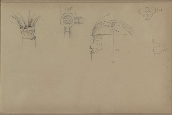 Editor: Here we have Carel Adolph Lion Cachet’s “Scharnieren,” which translates to "Hinges," created around 1906 using pencil on paper. It looks like a page torn from a personal sketchbook. What do you see in this seemingly simple study of mechanical forms? Curator: What immediately strikes me is how even simple hinges can become imbued with meaning when placed on the page like this. They aren't merely functional; they become symbols. The hinge represents connection, but also articulation, movement, even the possibility of change. What did “hinges” represent in 1906? Editor: Change? Social mobility? New mechanical age perhaps? Curator: Perhaps all those things. Notice how Cachet isolates each hinge, almost like presenting variations on a theme. Each one, although similar, possesses a unique configuration. That isolated repetition creates rhythm. But let me ask you, what feeling is conjured up by looking at these somewhat cold technical sketches on the page? Editor: Well, I initially thought these drawings feel sort of...unfinished and detached. But considering them as symbols changes the whole picture. Each isolated hinge might imply different methods of change or the various mechanisms that enable social reform? Curator: Exactly. This artist is almost treating mechanical design as a form of language, one filled with as much symbolic potential as traditional iconography. He could then employ design elements in painting or sculpture. It may even relate to Art Nouveau preoccupation with both organic and geometric forms. These "hinges," therefore, represent far more than just joining; they symbolize possibilities. Editor: I see them in a new light now! They are like a collection of different answers to one fundamental question about joining things, but also transforming how the message changes when we move them around! Curator: And that shifting significance— that's where the power of symbolic imagery truly lies, to give the user of the mechanism an emotive or empowering meaning for the objects of their life. Editor: Thanks; it has certainly opened my eyes to the depth even in something that seems initially simple.