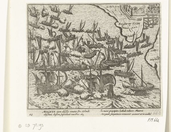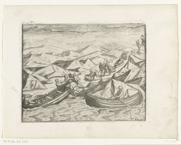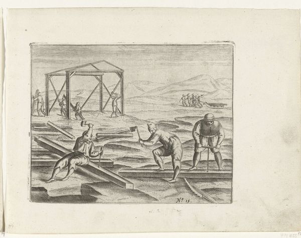 Editor: Here we have an engraving entitled "Slepen van hout op sleden naar de plaats waar het huis gebouwd wordt, 1596" – that’s "Dragging wood on sleds to the place where the house is being built" – dating from 1615-1617. It's by an anonymous artist, held here at the Rijksmuseum. The composition feels very linear and descriptive, like a detailed record of an event. How do you interpret this work through its form? Curator: Indeed. We can immediately note the prevalence of line, creating a structured, almost diagrammatic depiction of space and action. Consider how the artist uses hatching and cross-hatching. Where do your eyes go and why? Editor: They’re drawn to the group of figures hauling the wood. The lines seem denser there, creating more visual weight. But then I notice the ship. Its placement seems... odd. Curator: Precisely. The relationship between foreground and background elements presents a fascinating tension. The ship's isolation and high placement disrupt the naturalistic perspective one might expect. What effect does this create? How does it impact the surface plane? Editor: It flattens the space, making the ship seem almost pasted onto the landscape, which enhances the somewhat artificial feeling, right? Like the whole image is a constructed scene. Curator: Precisely. And what might this "constructed scene" convey? The emphasis shifts away from the realistic portrayal of an event and towards the symbolic or allegorical. The materiality of the print itself becomes significant; it is not trying to replicate reality but to present an idea, meticulously etched onto the surface. The relationship between the ship, figures, building all suggest a controlled artistic vision, where line dominates and structure becomes meaning. Editor: That’s a very interesting take! I see how focusing on the formal qualities really opens up new ways to understand the image. Curator: By engaging with form, we’ve explored questions of meaning-making inherent within artistic representation, thereby transcending a purely mimetic function. A useful reminder in art history, wouldn't you agree?