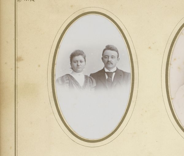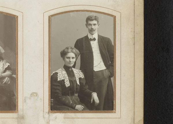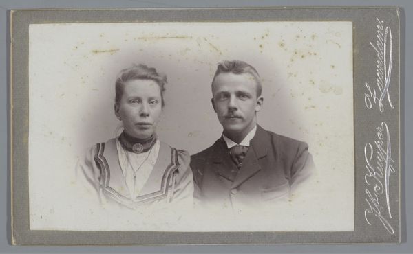 Curator: Here we have "Portret van een man en vrouw" (Portrait of a Man and Woman), a gelatin-silver print attributed to Fritz Schweisfurth, and believed to date from sometime between 1890 and 1920. Editor: It’s quite formal, isn't it? A sense of contained dignity. The monochromatic tones, combined with their upright postures, it speaks of a particular class and era. Curator: Absolutely. The clothing and poses speak volumes. The man, in his dark suit, positioned slightly behind, the woman in her high-necked blouse. It adheres to expected gender roles but it goes beyond just their attire, look at their faces: do they hold clues to understand that historical context? Editor: It's striking to think about the actual labour involved. The whole, quite cumbersome, photographic process in this period, the developing of the gelatin-silver print. Each aspect would demand skilled practitioners. And how much does such process define the kind of poses they are adopting here? Curator: Indeed, this wasn't instant gratification. It would take time to have your portrait taken and then printed like this. In a way, that labour and skill involved only reinforced its importance. The clothing itself—that pristine white blouse, or the tailored suit—speak of status and careful construction too. These sartorial codes are fascinating symbols in themselves. Editor: You know, thinking about it in those terms of value creation really grounds it for me. It makes me wonder how such photo would be regarded in our current moment? This image once held significant value as object, a symbol of familial and personal memory—its transformation across different spaces in time is intriguing. Curator: Precisely! It invites us to reflect not just on that initial act of image-making but also about their meaning in relation to cultural memory. This image would communicate values of order, permanence and also maybe ambition. It is frozen as a symbolic representation to be looked at in generations to come. Editor: Well, now when I look at this portrait I am struck with how all the different stages and efforts have produced this image, which now lives in its very unique temporality and status. Curator: Agreed, it has that special layered history of past lives recontextualized in our gaze of today.
