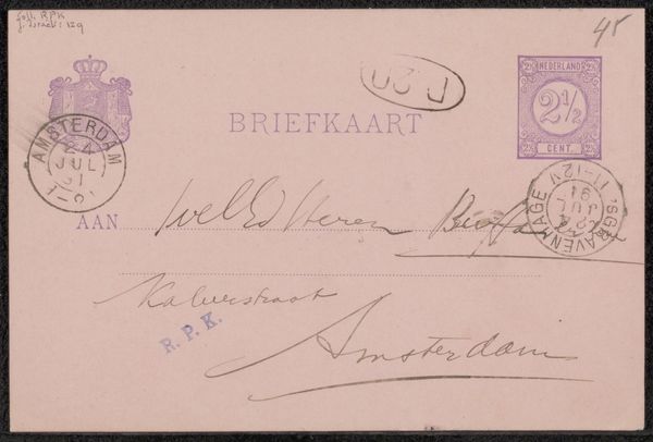 Here is the back of a briefkaart, or postcard, sent by Suze Robertson to Philip Zilcken likely in the late 19th or early 20th century. The card itself is made of processed paper, designed for mass communication. We see this in the printed text ‘Briefkaart’ and the pre-printed stamp box. Yet the handwritten address and the sender’s name transforms this humble object. Robertson, known for her sympathetic depictions of working-class life, here engages with the very means by which lives were connected within industrializing society. The act of writing on this card personalizes an otherwise standardized form, connecting the world of art with the daily life and labor of its participants. It’s a reminder that even the most seemingly mundane materials can carry profound social and personal significance. Understanding how this briefkaart was made, and the context of its use, gives us a richer appreciation of the artist and her world. It challenges the division between fine art and the everyday expressions of life.