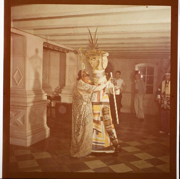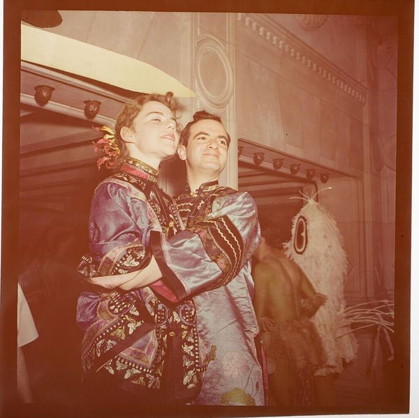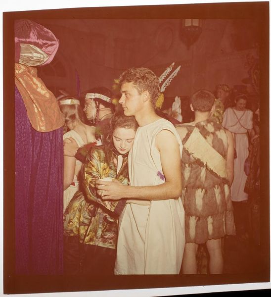 Curator: This is an untitled photograph by Jack Gould, part of the Harvard Art Museums collection. It shows people in costume at a Beaux Arts Ball, with some dressed in Native American and Hawaiian attire. Editor: My first impression is a certain awkwardness. The composition feels very posed, and the color palette, while vibrant, adds to the overall slightly unsettling mood. Curator: Indeed. The photograph’s power resides in its capturing of a specific moment in time, revealing the complex social dynamics around cultural appropriation and representation. We are prompted to question the colonial gaze inherent in such displays. Editor: Absolutely. The costumes themselves, with their inaccurate and stereotypical portrayals, demonstrate a superficial understanding of diverse cultures. The photograph serves as a stark reminder of the historical insensitivity that continues to affect contemporary society. Curator: Yet, from a formal perspective, the composition is striking, with the figures arranged in a manner that draws the eye across the frame, highlighting the contrasting textures and forms. Editor: Agreed. But it's impossible to separate the formal elements from the problematic content. It's a visual lesson in the power of context. Curator: A potent example of how art can provoke critical self-reflection.